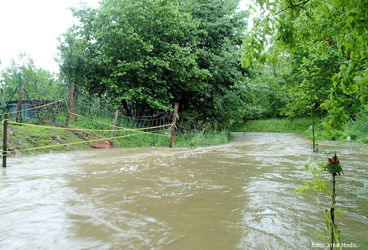 Potok znám velice dobře, vždyť to na něj mám sotva 10 km. Zajíždíme pod malou přehradu, která má za úkol zmírnit velkou vodu. Výpustí se žene odhadem asi 5 kubajzů, což je bezpečný ale luxusní průtok pro splutí. Nasedám za nízkým mostem těsně pod hrází. Zpočátku se vyhýbám několika keřům, které za tohoto stavu trčí z vody. Musím se taky asi dvakrát sehnout pod dráty elektrického ohradníku. Tyto překážky jsou ale jen v úvodu a dál je plavba pohodlná a přehledná. Bartošovický potok teče rychlejším a klidným proudem bez peřejí mírnými zatáčkami.