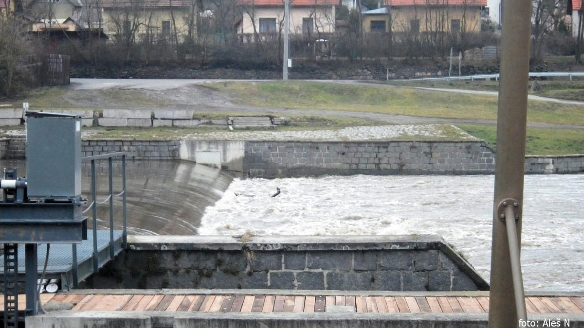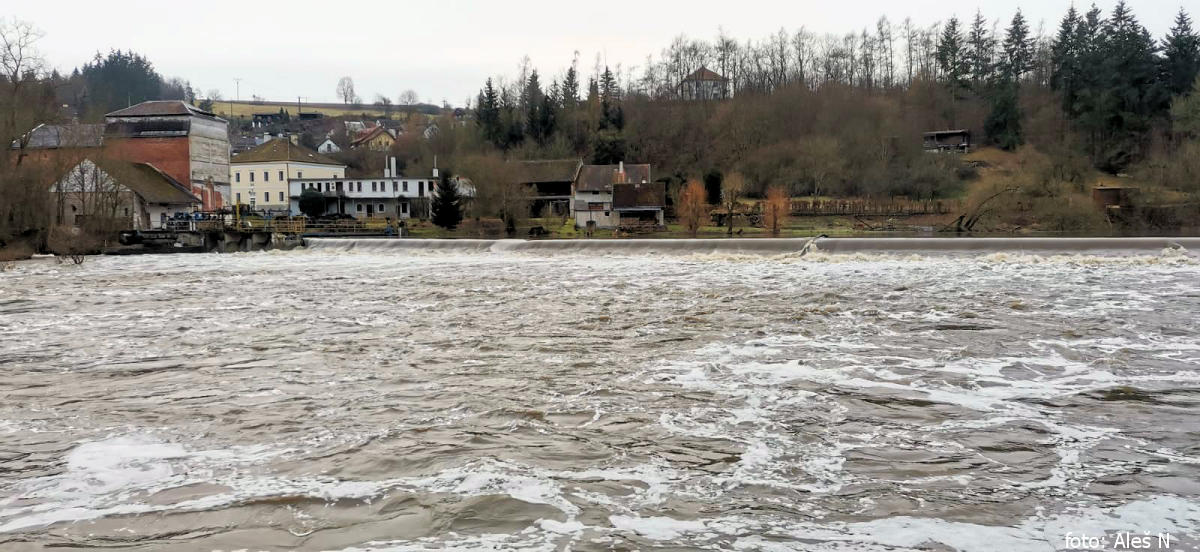 Pak už jen krátký dojezd na jez v Hýskově. Ten má vysokou vlnu a ve většině délky je bez válce. Pro porovnání opět přidávám foto z povodně 2013.