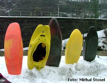 Další nemilé překvapení nás čekalo o pár set metrů dál nad jezem pod Malým Rabštejnem. Mojmír zlomil loď, ztratil botu a omrzla mu noha. Bylo to jasné, nemohl ji sám a bos donést 3 km k autu. Jediná vhodná loď, na které se mohl, vzhledem k jeho dlouhým nohám, svézt dolů byla ta moje. V ten okamžik se pro mne sjíždění Bystřice stalo pochodovým cvičením. V kopcích s hlubokým mokrým sněhem a kde nebyl hluboký sníh, byl led, zlomená loď na rameni – fakt slušný trénink. Vyrazil jsem vstříc svému osudu a do té výšky ke mně jen doléhaly vzrušené výkřiky mých kamarádů v klikatém údolí. Až mnohem později jsem se dověděl, co se na řece dělo. Kousek pod jezem čeká na vodáky nepříjemný válec, ve kterém málem skončila cesta pro Sysla a statečnou Jitušku. Oba si teď mohou na svou lodičku přilepit další krysu. Zachraňovali se lidé, materiál. Parta se roztrhla. A tak se stalo, že hned, jak jsem dorazil na Magdalénský mlýn, odcházím zpět proti proudu s Vildou zachraňovat loď přimáčknutou řekou na kmen a když jsme se vrátili, vyrážím, tentokrát s Renčou, hledat Jitku, která někde zůstala s Martinem. Doskotačili jsme až zpátky na Rabštejn aniž bychom kohokoliv našli. Někde jsme se minuli. Když jsme se dlouho nevraceli, vyrazil nás hledat malej Čenda … hezká pohádka … nakonec přeci jen došlo ke šťastnému shledání a unavení, hladoví vodáci se mohli přesunout do Hanácké restaurace, pak do Cin Cin baru, kde jim ochotný, sympatický a atraktivní personál (Alenka a Lenka) dovolil využít prezentační techniky, takže, se sirkami v očích, mohli shlédnout aktuálně pořízené záběry.
