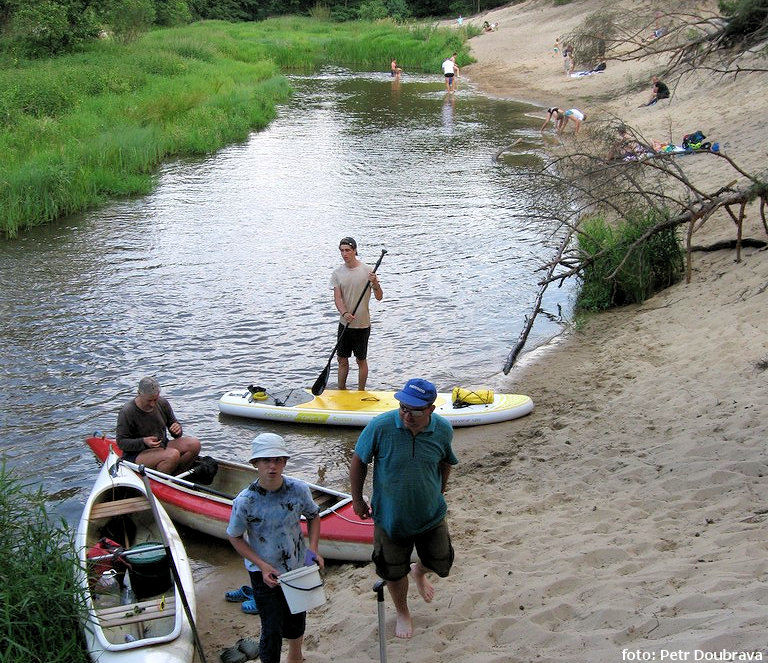K dokonalému kontaktu s přírodou přispívají i přičinliví bobři se svými šikovnými zoubky a packami. Vždy jsem věřil, že bobr evropský vodní hráze moc nestaví. Už tomu nevěřím. Jsou krásné, pevné, lodí je neprorazíte, spíš naopak. Zejména úsek od Kužnice k prvnímu jízku v Jamborku je velmi pomalý, opravdu tak kilometr za hodinu. Později se potok trochu zvětší, plavbu zbrzdí jen přenášení několika jezů. U osady a mlýnu Talarz je to trochu bludiště, řeka se rozděluje. Pravé rameno mizí v jezu, který je totálně zamaskovaný flórou, jakožto nesjízdná a neschůdná peřej, levé mizí v mlýnu. Nejlépe přenést kolem mlýna vlevo do odpadního kanálu. Na spěchající vodáky tady číhá velké nebezpečí v podobě občerstvení, kde krom polských tradičních značek, fritek a lodů, mají i Holbu… V lesních partiích kolem chatových osad před osadou Barycz pak čeká další lákadlo. Řeka se nakrátko otevírá v kouzelných meandrech s písečnými břehy a plážemi lákajícími ke koupání a lenošení. Nutno dodat, že k lákání přispívá i Jadwiga, Agniezszka, Ania, Tania a další lepé, slovansky vybavené rusalky. Jak vidno, plavba je tedy pomalá a namáhavá, určitě lepší je splutí bez těžké bagáže, ale alespoň se dvěma karimatkami a větším stanem… Což platí i pro druhý den plavby mezi Baryczem a Marzeninem.