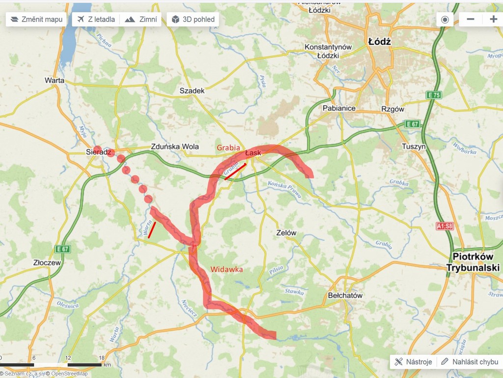 Widawka (50km) je už významně větší řekou. Její průtok je nadlepšován vodou čerpanou z obrovských hnědouhelných povrchových dolů v Belchatowě a Szczerowě. Voda je tak trochu kalnější a studenější, než Grabia, ale plavba je zase daleko pohodlnější a rychlejší. Řeka tak svým osudem trochu připomíná naši opomíjenou Bílinu.