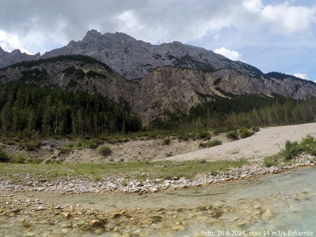 Isar je celkem na pohodu, obtížnost okolo WW II+, pak se zmírňuje. Nahoře úzký s peřejemi, pod Scharnitz se rozšíří a v rychlém proudu je množství balvanitých stupňů, které se s opatrností dají projet. Stav v horní části byl 14 kubíků, níže jsme měli 19 kubíků v Mittenwaldu. Ujeli jsme 20 km s přestávkami za 4 h. My jsme se hodně zdrželi dojezdem na náhorní plošinu a po dojezdu byla opět velká bouřka, takže jsme již nikam nešli. Pokud jste v místě, jeďte lanovkou z Mitenwaldu do 2000 m, kde jsou nádherné výhledy. Jinak taxi funguje od 1. června a mají na lodě i vlek, ale doporučuji si vše domluvit předem.