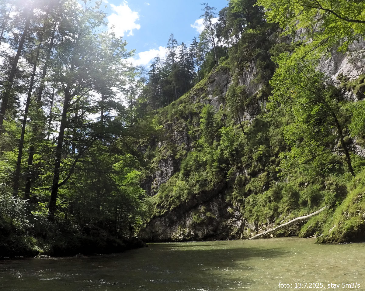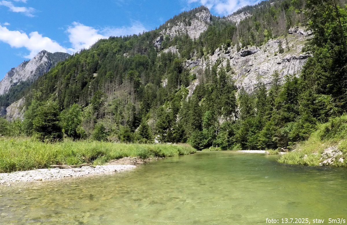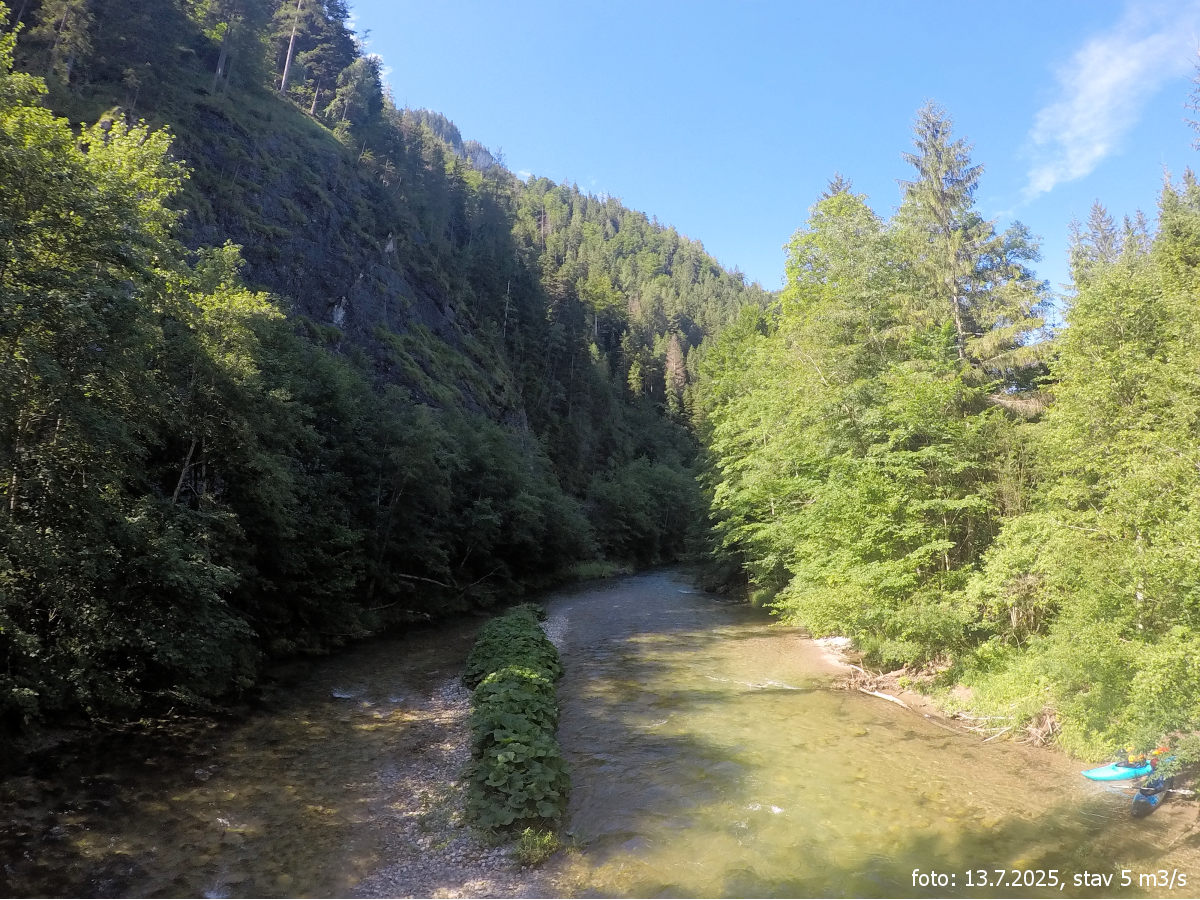Po splutí Schwarzy a Muru s proložkou feratového lezení kousek od výstupního místa na Muru, se druhý den přesouváme k horní Salze. Jako na předchozích dvou řekách, kde bylo vody málo, se obáváme, jestli bude úsek vůbec sjízdný. Jedeme po silnici po proudu řeky od Gusswerku až k mostu, kde širší údolí se začíná více zužovat a skály se přibližují k řece. Na parkovišti u silnice, kde je i pěší most, necháváme auto a vyplouváme. Vodočet hlásí sotva 5 kubíků, což na 13. července je poměrně dobrý stav, ale je to stav opravdu minimální.