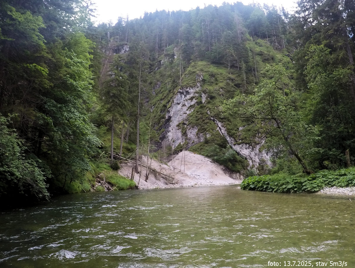 Pokračujeme dál a po chvíli zastavujeme na levém břehu u velkého štětkového náplavu v rozsedlině mezi skalami. Mezi kameny nic neteče a nedá se tak poznat, co se ukrývá o pár metrů výše. Vystupujeme a jdeme kamenným suťovištěm, kde jistě za dešťů teče voda.