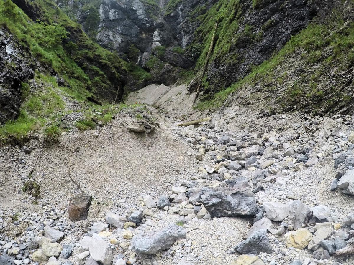 Horní úsek Salza schlucht - štěrkový náplav a cesta k vodopádu