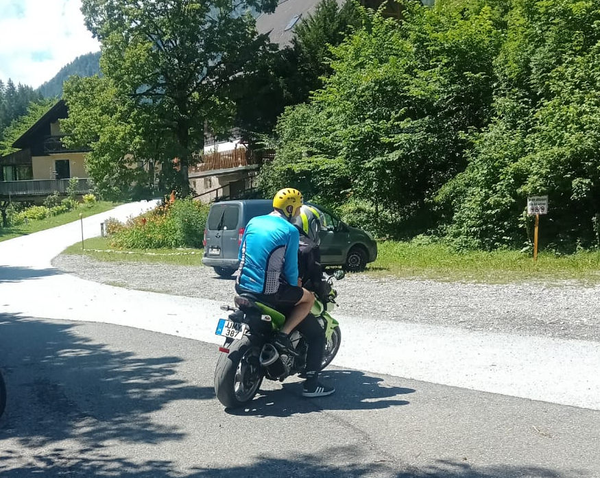 Při převlékání ze sucháče do cyklo oblečení najednou přijede motorkář a jde do kadibudky. Váhám, ale pak mi to nedá. Ten přijel pro mě. Jdu za ním a zkouším konverzovat. Nejprve zkouším mezinárodní češtinu, pak anglicky a nakonec se z něho vyklube maďar jak poleno. Že prý trochu německy. Nějak pochopí, že se chci dostat nahoru pro auto, ale on zrovna z toho směru přijel a jede opačně. Co se dá dělat. Smutně odcházím. Připravuji se na opruz s kolem, když tu borec přijede k nám a kývne hlavou. Není čas přemýšlet, kdo je kdo. Vezmu svoji žlutou vodáckou helmu a v cyklo kraťasech s vodáckým tričkem sedám za něho. Jen stačím říci: „langsam“, ale v maďarštině toto slovo znamená asi něco jiného, než v němčině.