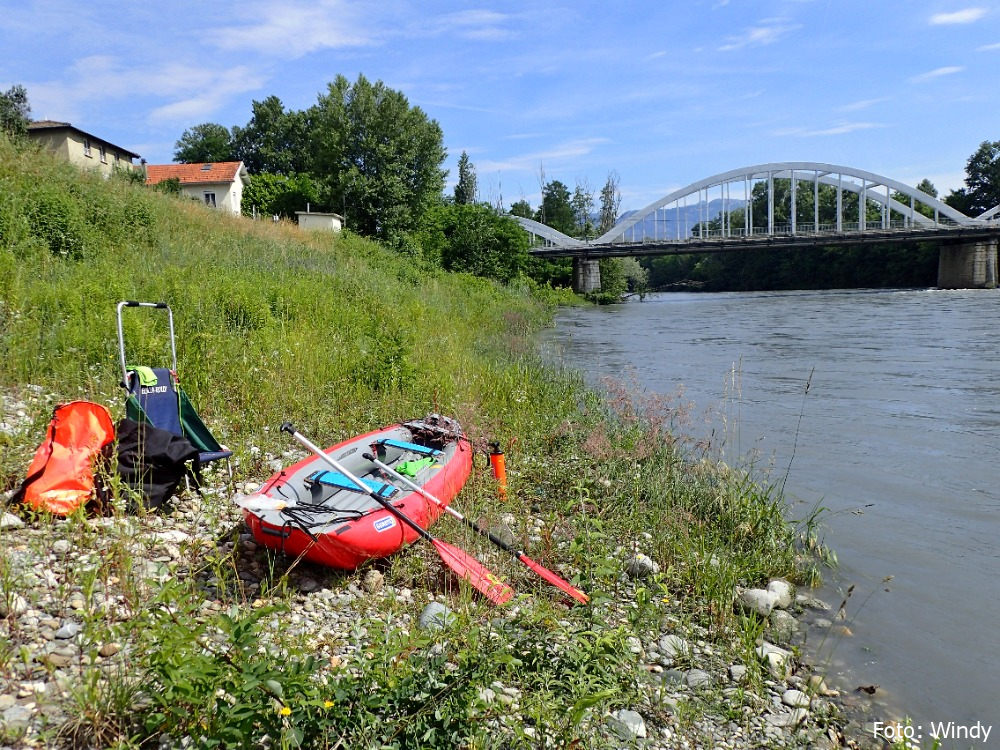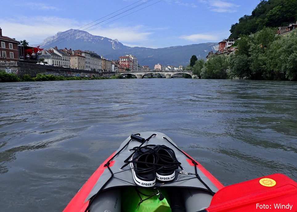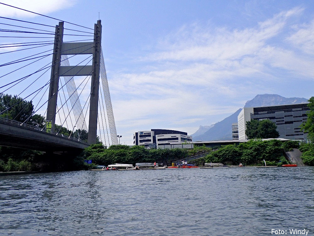 Druhý den nás čeká 22 km. Zdá se, že vody je o trochu více než předchozí odpoledne. Vyrážíme okolo desáté. Charakter řeky se nemění, rychlý proud, vysoké břehy, výhledy na okolní hory. Po necelých sedmi kilometrech dálniční most prakticky na začátku souvislé zástavby Grenoble a jeho předměstí.