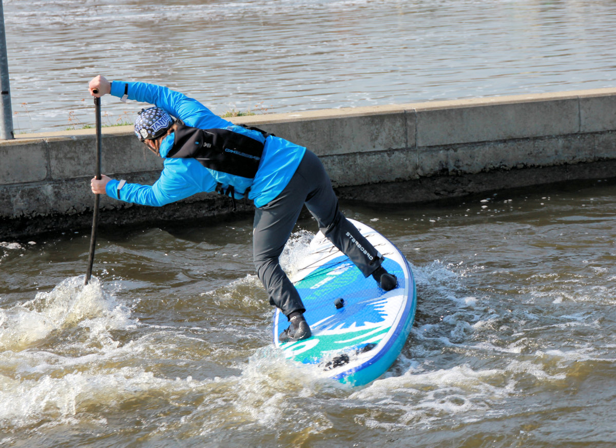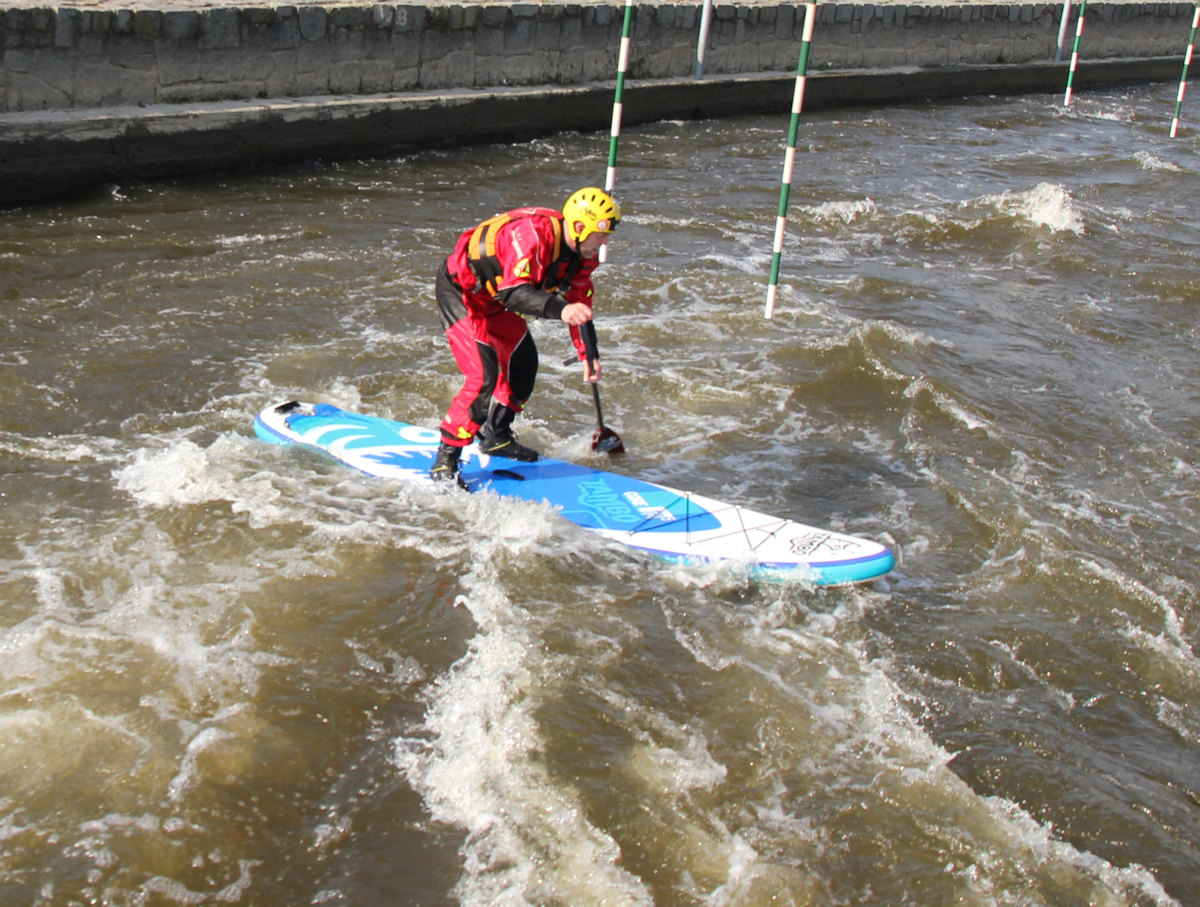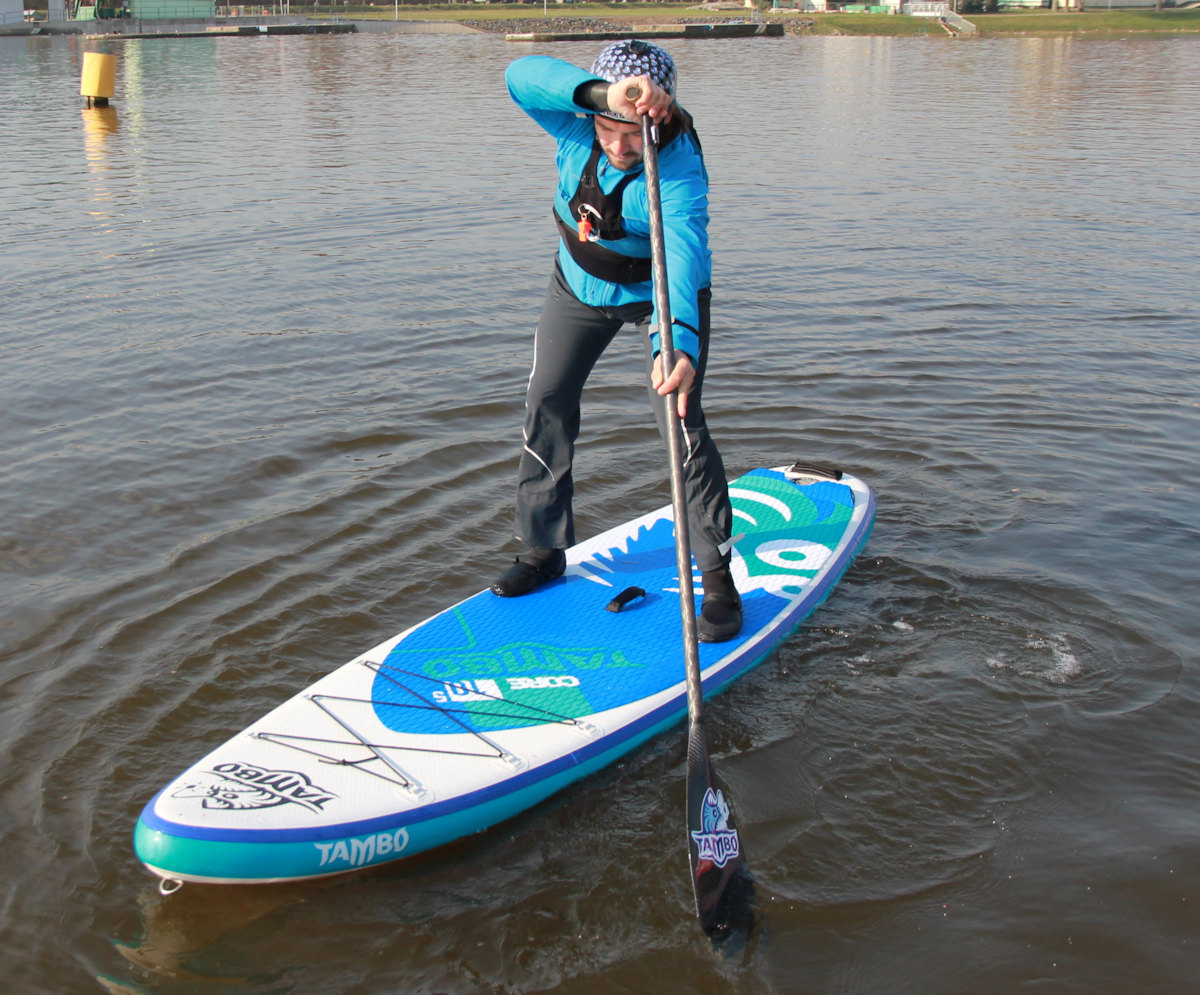 Po úvodu, jak se na prkně stojí, se přesunujeme nahoru nad kanál. Mé první nastupování je velmi obezřetné, ale po chvíli získávám alespoň na chvíli určitou stabilitu. Je důležité mít nohy dobře rozkročené na šířku uprostřed prkna a hlavně mírně pokrčené, tělo narovnané. Pádlování se pak jako u klasických lodí odehrává tělem místo rukou a řeší se podobné záběry, jako u kánoe – vpřed, přítahy ke špičce, i se dávají záběry přes ruku. Délka záběru je jen od přídě k úrovni těla, dále se již nepokračuje. Je to podobné, jako na háčku kánoe.