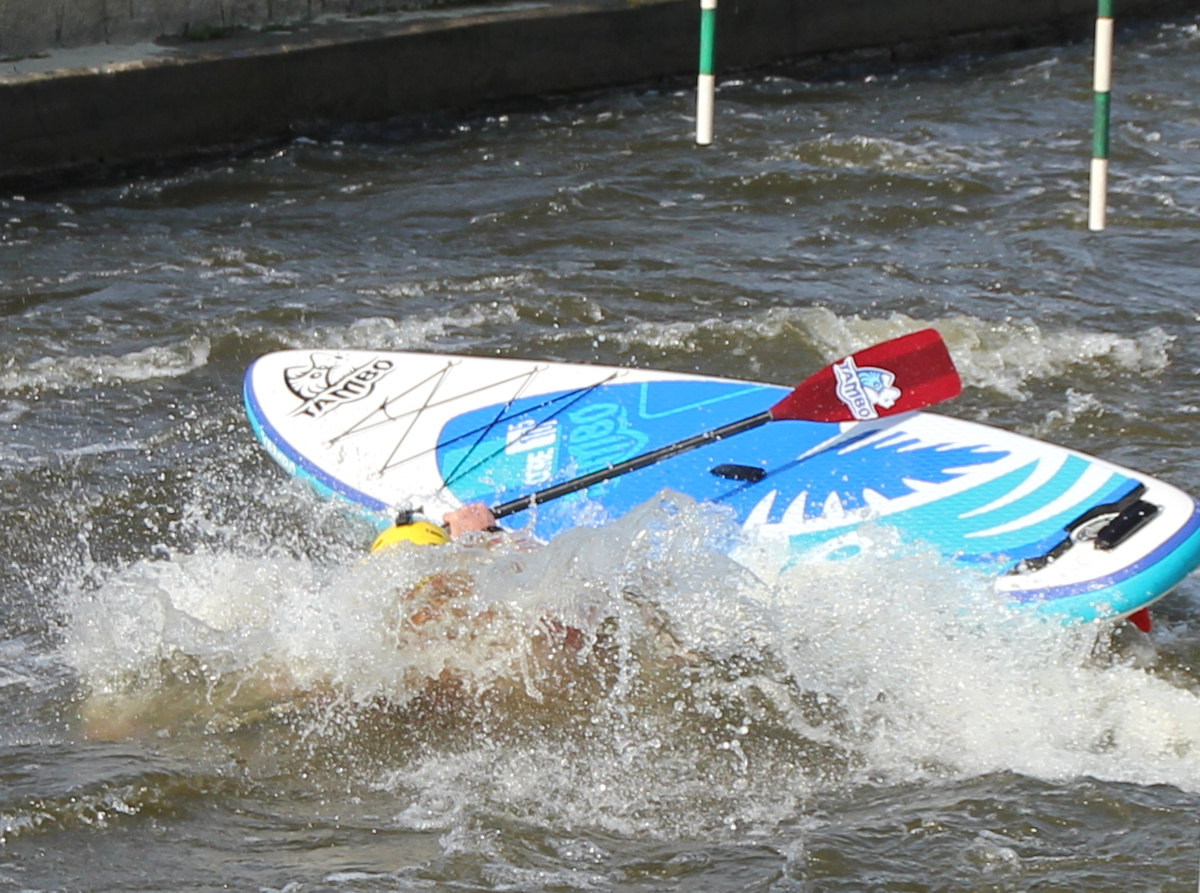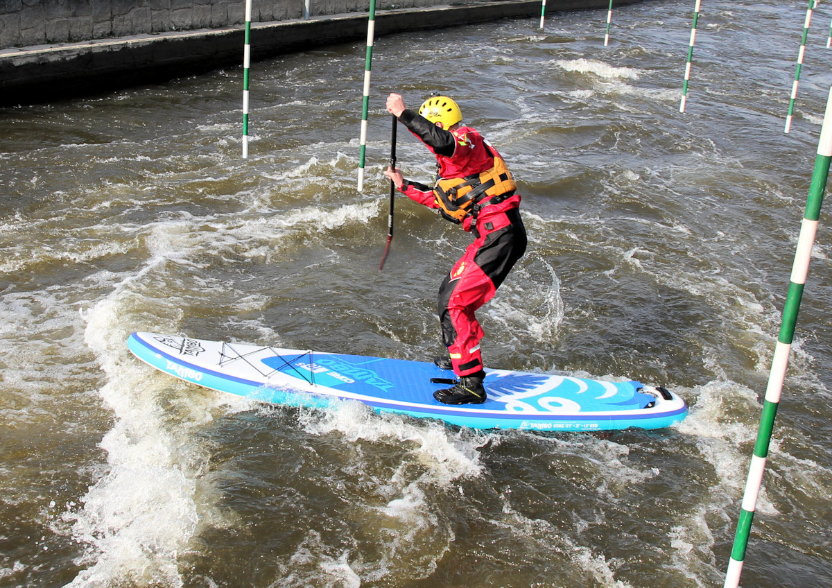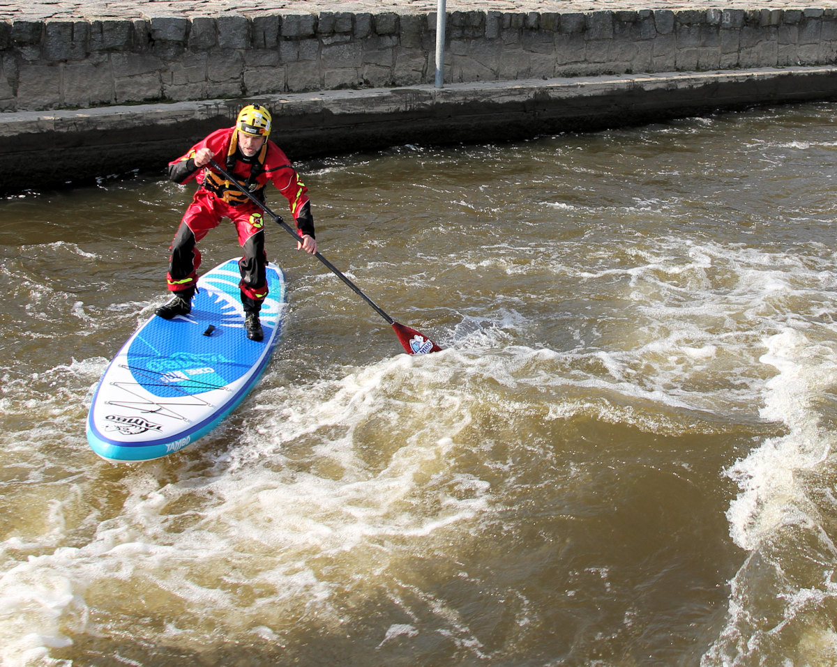 Po úvodu, jak se na prkně stojí, se přesunujeme nahoru nad kanál. Mé první nastupování je velmi obezřetné, ale po chvíli získávám alespoň na chvíli určitou stabilitu. Je důležité mít nohy dobře rozkročené na šířku uprostřed prkna a hlavně mírně pokrčené, tělo narovnané. Pádlování se pak jako u klasických lodí odehrává tělem místo rukou a řeší se podobné záběry, jako u kánoe – vpřed, přítahy ke špičce, i se dávají záběry přes ruku. Délka záběru je jen od přídě k úrovni těla, dále se již nepokračuje. Je to podobné, jako na háčku kánoe.
