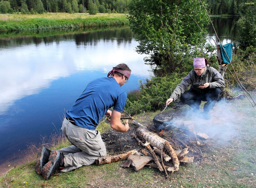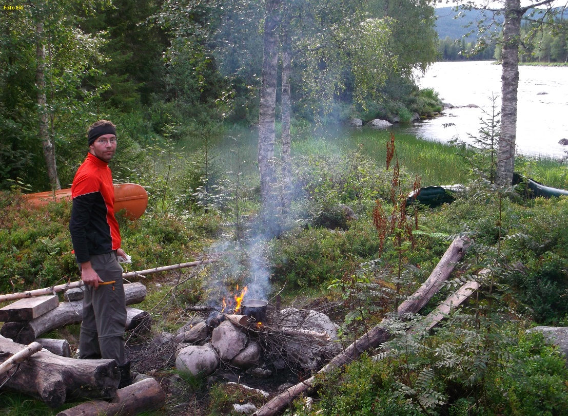 Vaření na ohništi opuštěné chatkové osady u Trysilelvy