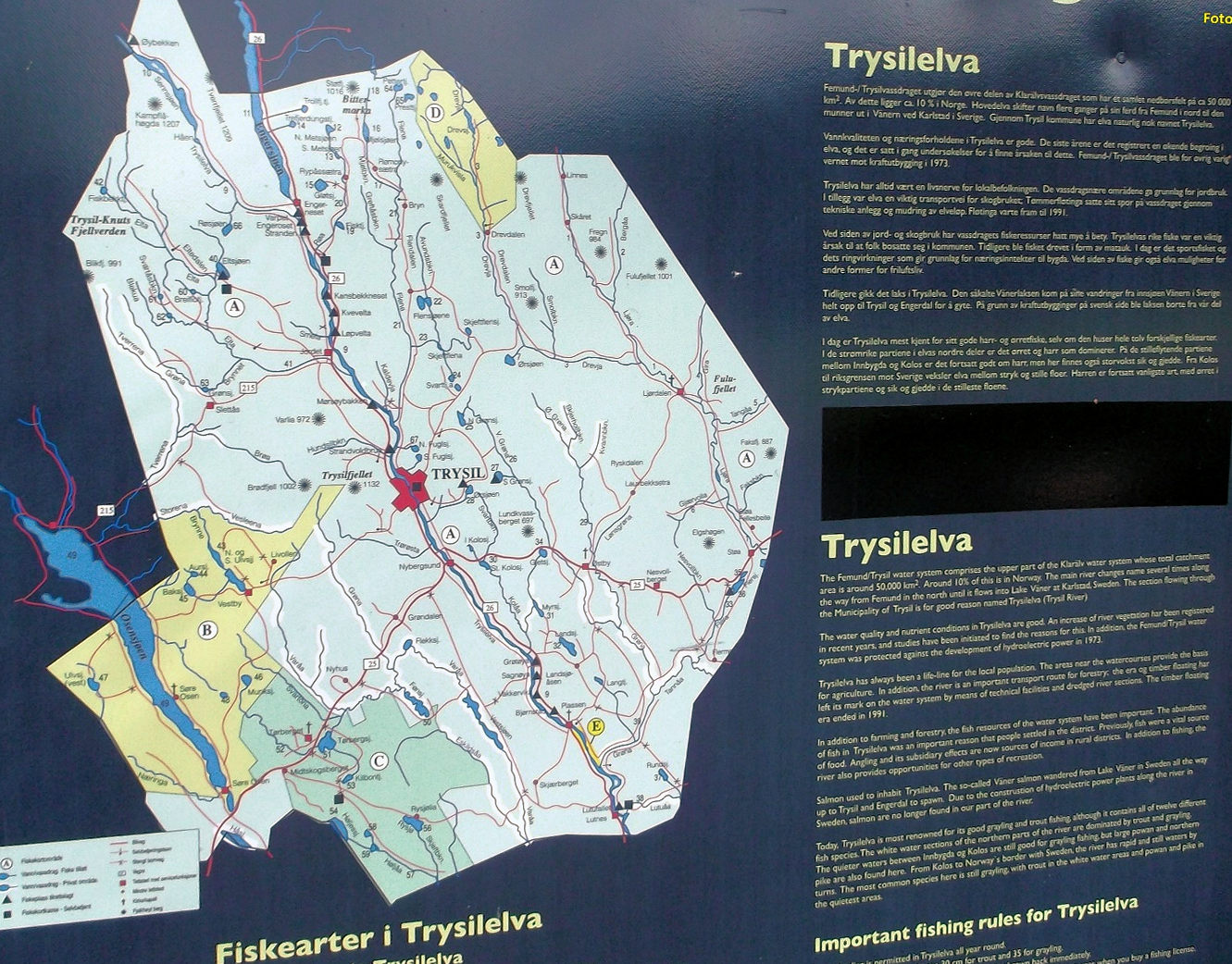 Doplouváme do městečka Trysil, kde se setkáváme s civilizačními výdobytky. Fotím ještě informační mapku naší cesty. I tady mají rybáři zjevně navrch před vodáky.