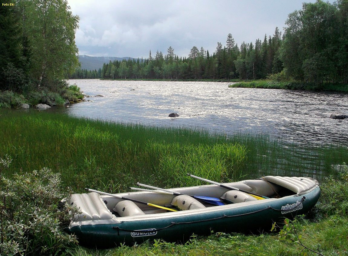 Zaparkovaný raft Colorado u řeky Trysilelva