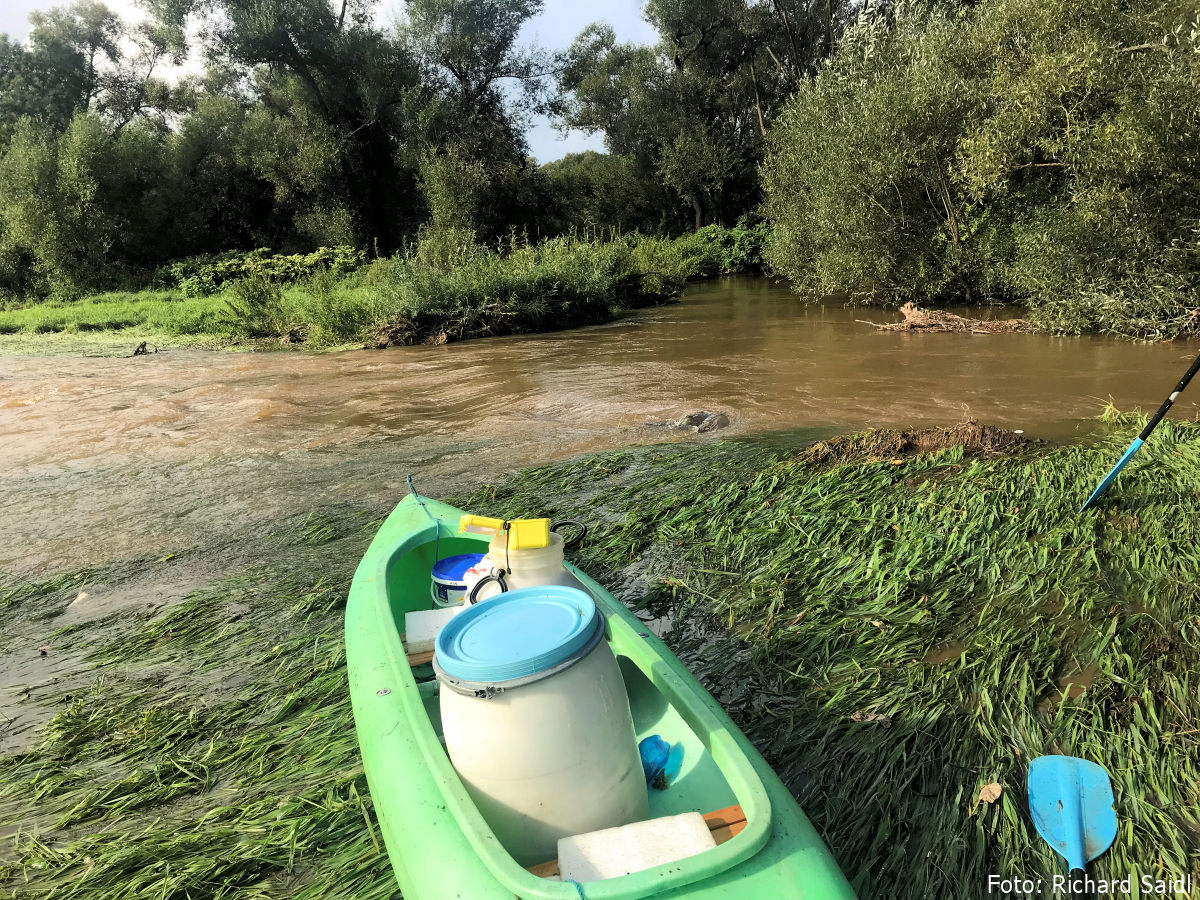Peklo začíná pod přivaděčem na dálnici na km 18,1. První zátaras přetahujeme, druhý „obtahujeme“ přes rákosí, ale voda odtéká někam úplně mimo koryto řeky. Vracíme loď do řeky, abychom po 30 m zase přetahovali přes louku. Na dalším místě vytéká silný proud na louku a mizí v dáli v křovinách.