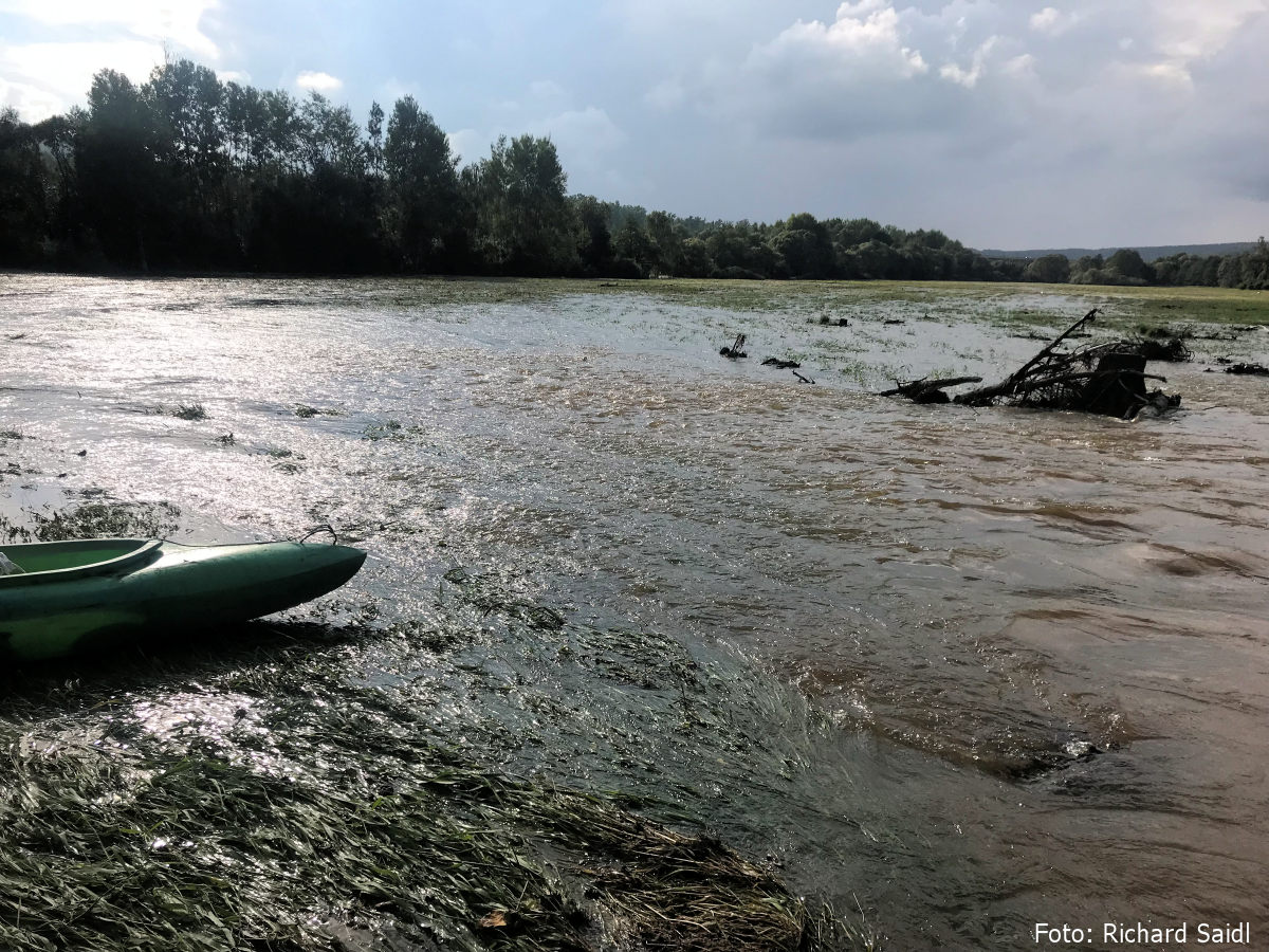 Tam vytahuji, táhnu do další laguny na louce, a pak dokonce na louce i oba pádlujeme. Voda mizí v dalším křoví, ale blízko je hlavní koryto a vypadá lépe. Na začátek vzdutí už pouze jedno přetahování.