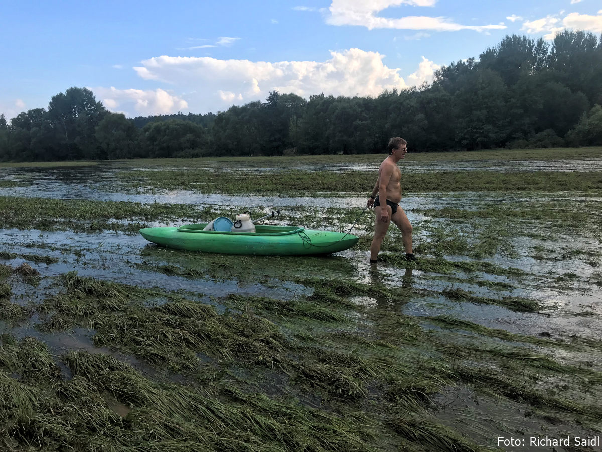 Rozhodnutí je jasné, dále táhneme po louce. Zapřáhnu se za loď, na manželku pronesu kouzlenou větu Бурлаки на Волге тянут речное судно против течения „burlaci na Volze táhnou bárku proti proudu“, a táhnu. Bohužel jsme na špatné straně a vody je tu méně. Za 400 m voda mizí v zarostlém slepém rameni. Hledáme řeku, abychom našli zátaras před námi i za námi. Loď dáváme na vodu pouze za účelem traverzu na druhý břeh.