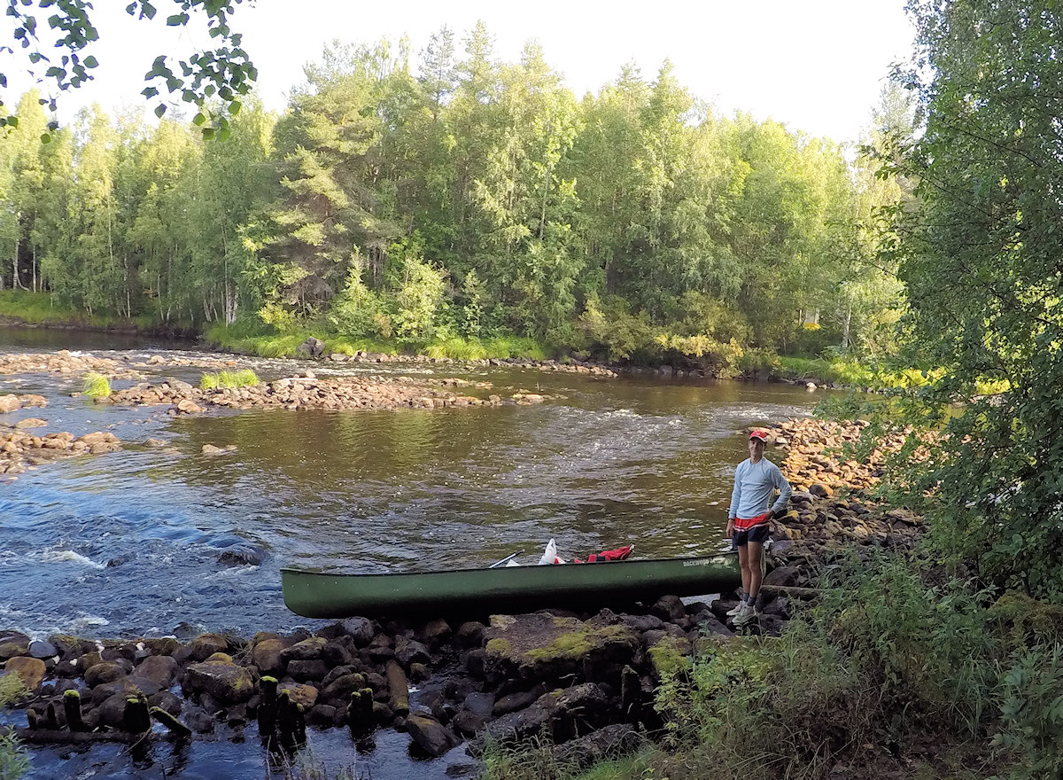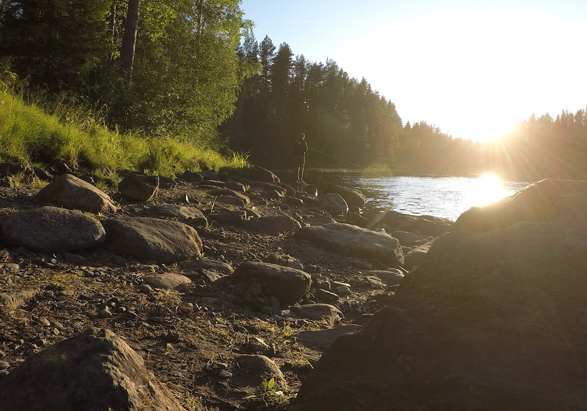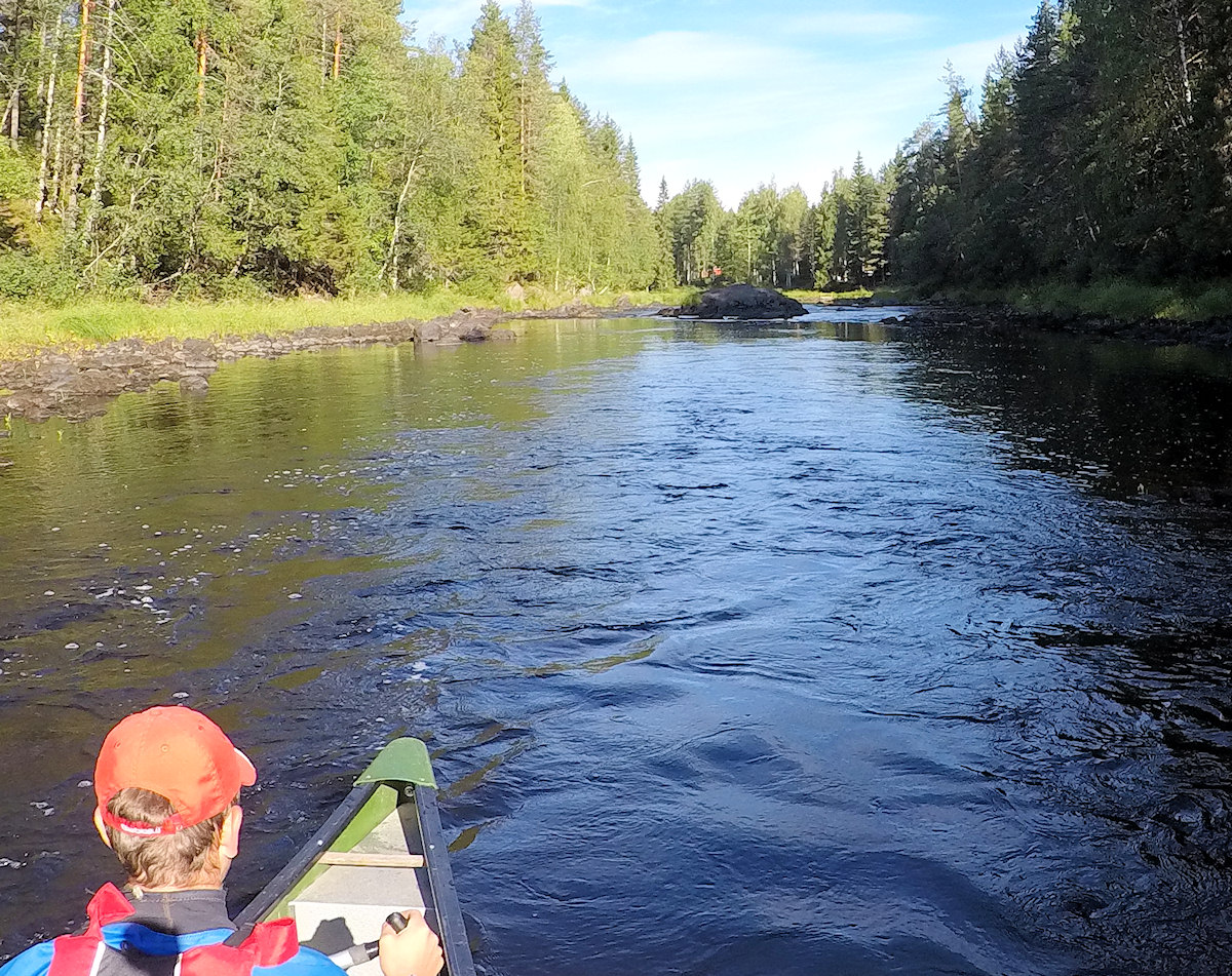 Na řece není jediný jez a i když bylo málo vody, prakticky všude jsme projeli bez vystupování. Jen na konci, když se řeka ještě rozšíří, jsme museli krátce loď přetahovat, jinak v podstatě nebyl problém. Jenže díky podstavu jsme si nemohli užít tu pravou vodáckou pohodu v krásných peřejích. Navíc se nám nepodařilo chytit ani jednoho lososa. Harri tvrdil, že je moc teplo a že neberou. Je pravda, že na řece jsme nepotkali žádného rybáře a přitom je to vyhlášená řeka pro rybolov. To bylo pro nás velké zklamání. Jen upozorním, že pro chytání musíte mít zakoupený permit, který na týden stojí 20E.