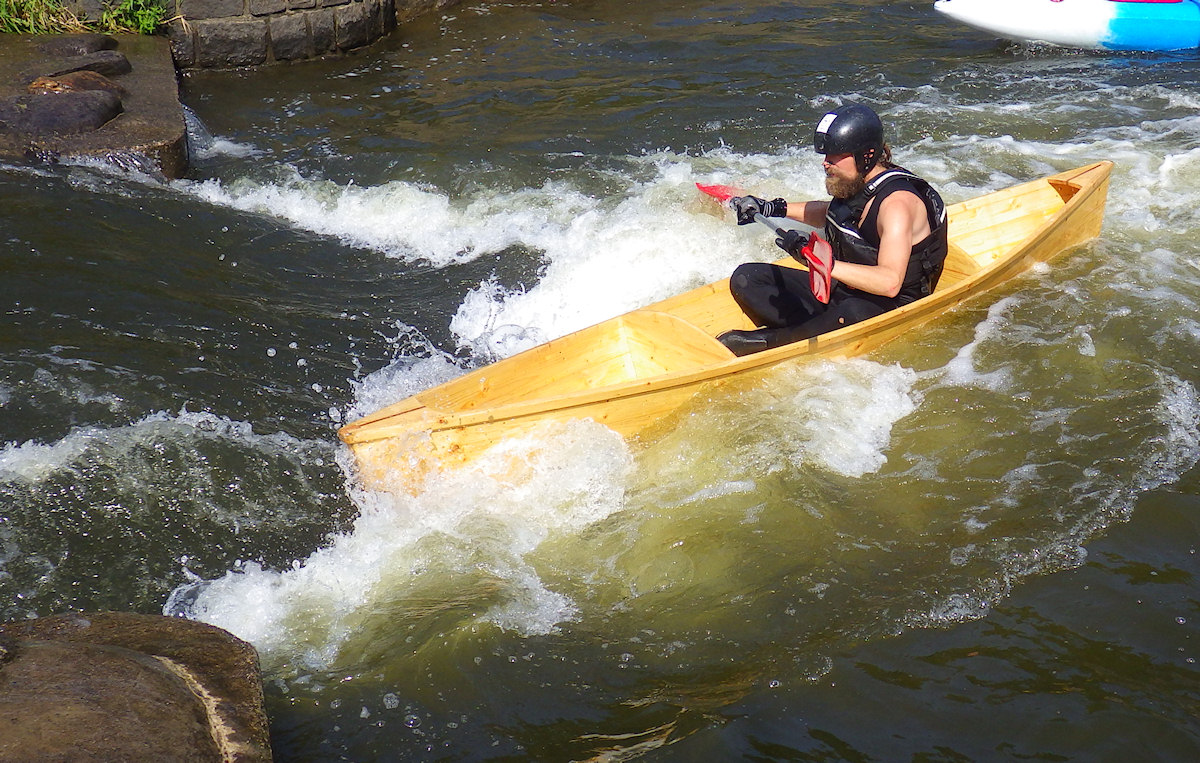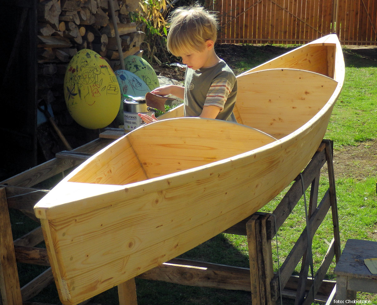 Po poslední vrstvě oleje jsem vše nechal pár dnů zaschnout a poté loď voskoval směsí včelího a karnaubského vosku s terpentýnem. Terpentýnu je potřeba dát zase pár dní čas na schnutí, pak lze povrch přeleštit a už lze vyrazit na testovací jízdu, třeba na místní rybník. Maňásek se osvědčil, neteče do něj spodem a krom zmíněných sportovních výkonů je to skvělá vodní hračka pro děti, se kterou si dokážou hrát opravdu od rána do večera. Samozřejmě pokud možno s plovací vestou a přiměřeným dohledem.