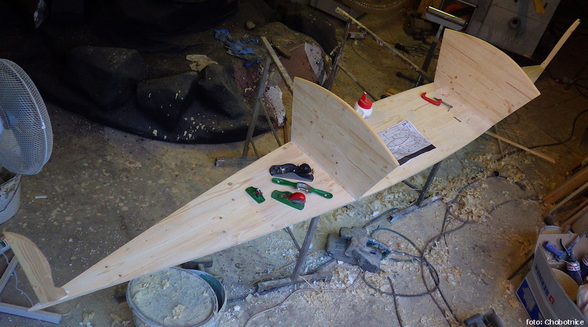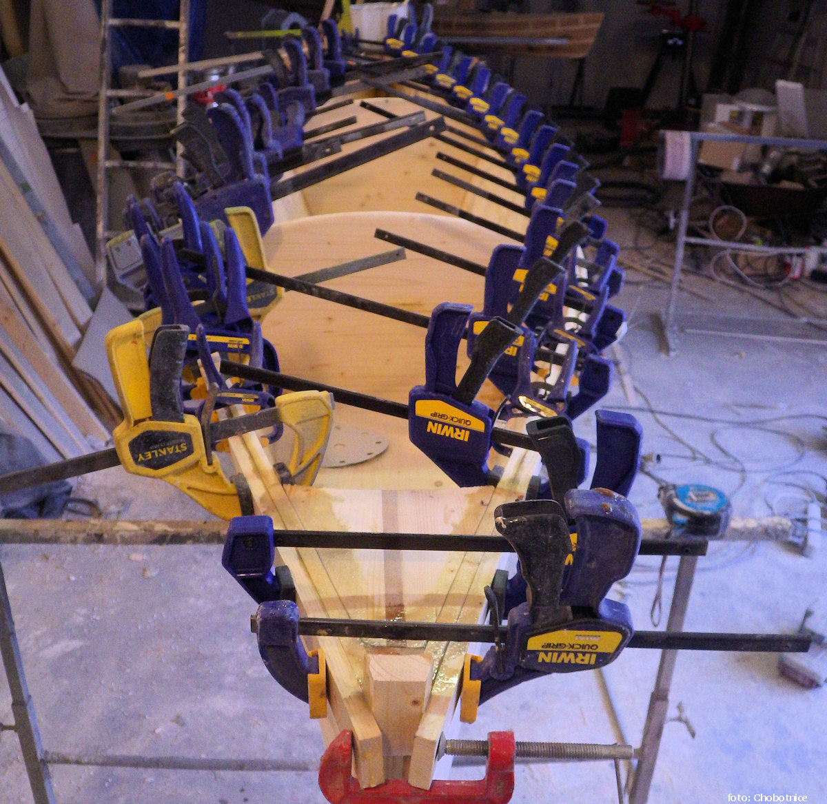 Čočkovitý tvar dna a nahoru se rozšiřující čílka, tím je dán výsledný tvar lodi s podélně prohnutým dnem. Namazal jsem všechny styčné plochy epoxidem a jal se stahovat díly k sobě. Pro tuto činnost se mi krom truhlářských svěrek osvědčily silné ráčnové kurty. Když byly všechny díly staženy k sobě a tím i ohnuty, zajistil jsem je vruty a ty zatmelil tmelem z epoxidu a jemných dřevěných pilin od brusky. Druhý den po odebrání svěrek a kurt jsem přilepil bortové lajsny, které jsou důležité pro pevnost celé stavby.