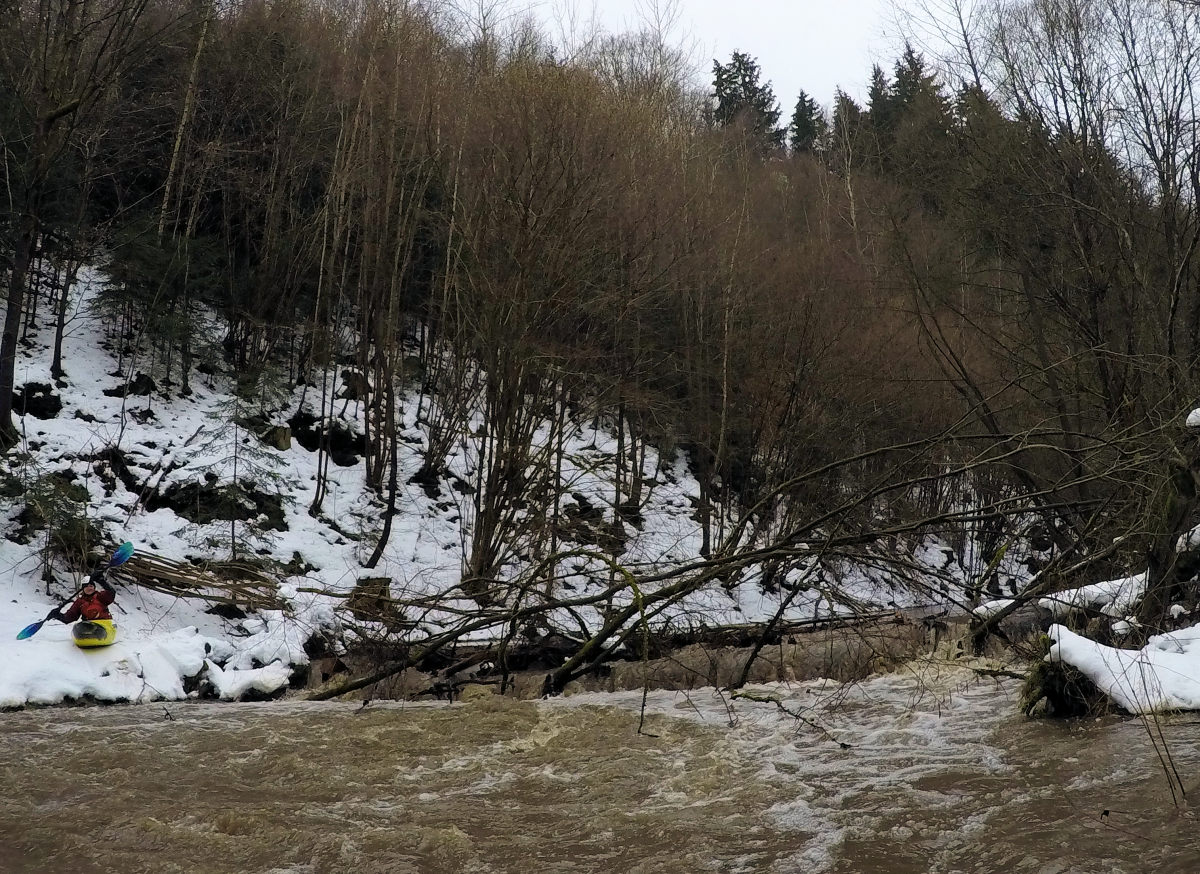 Není v něm žádný válec, splout se dá bez obtíží, jen se musí loď na koruně stočit ve směru šikmého jezu. Pak už se začíná údolí více svírat a přichází nejhezčí úsek. Lesy zde dostaly hlavně na začátku pořádně zabrat od kůrovce, dále už takové holiny nejsou vidět. Obdivujeme skály překryté vrstvou ledu vytvářející malý ledopád.