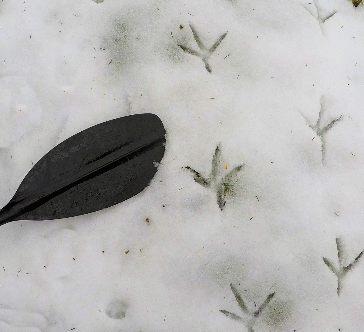 Jen jeden velký zátaras jsme museli vyřešit obchůzkou po břehu s využitím sněhu, kdy jsme se přitahovali za větve na klouzali s loděmi okolo padlého stromu.