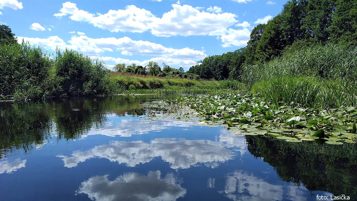 Druhý den jsme chtěli strávit odpočinkově a plout jen 9 km do Stareho Dworku (to nám nakonec zabralo asi 4 hodiny). Ještě asi dva kilometry pod hrází pokračuje Obra zapadaným korytem, načež se pod městečkem Bledzew změní charakter toku, ubývá napadaných stromů a meandry obklopí vysoké stěny z rákosí lemovaného stulíky. Je to tu plné zvířat. Viděli jsme z řeky pít čápa i maličkého kolouška, který sotva stál na kopýtkách a snažil se napojit u ústí potůčku do Obry. Potkali jsme i labutí pár se dvěma mladými a celá rodina nám ochotně zapózovala do objektivu.