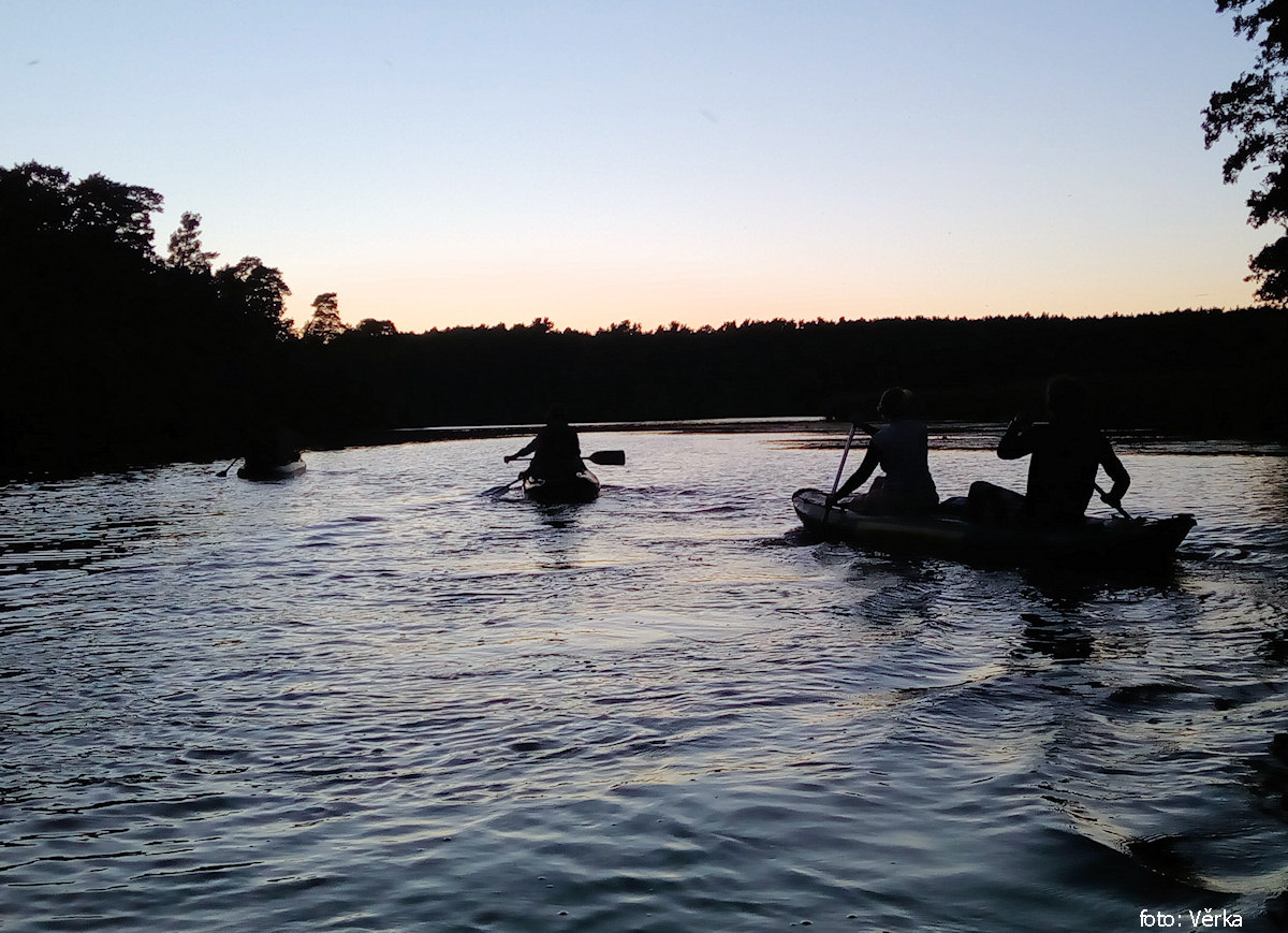 Postupovali jsme jen pomalu, jak se na zapadanou řeku patří. Kolem ř. km 34 se po levé straně objevila oáza odpočinku uprostřed lesní divočiny – tábořiště s velikou loukou, která dávala tušit, že o víkendech jsou zde davy. Ale v pondělí, kdy jsme tudy pluli my, zde nebylo ani pádlo. Hned kousek opodál stála útulná rybárna, kde nabízeli vlastní ryby na X způsobů a za rozumné ceny (dávám jednoznačné doporučení). Poté se Obra ještě několik hodin klikatila a pozvolna se rozšiřovala, až nás obestoupily vody táhlého bledzewského jezera, které je plné stulíků, leknínů a šumících rákosin. Jezero je podobně meandrovité jako řeka, má spoustu záhybů a zátok. Bory na jeho březích šumí, vodní ptactvo haleká a rybáři číhají na sumce. Protože jsme ten den vyráželi pozdě (cca v půl třetí), zastihl nás na jezeře neplánovaně soumrak – a bylo to nádherné. Měli jsme štěstí na počasí, bylo přiměřené teplo, vzduch svěží a viditelnost dobrá – ovšem za větru a deště bych přes setmělé jezero pádlovat nechtěl.