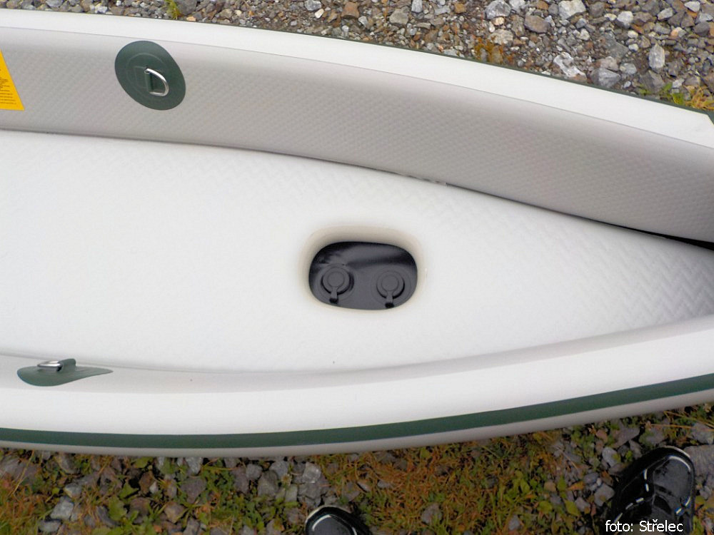 Příčný profil lodě připomíná široké otevírající se hranaté „U“, boky jsou hodně nízké. Konstrukce je tříkomorová (boky + dno), díly jsou spojené přeplátováním pásy materiálu jak zvenčí, tak po většině délky i zevnitř. Špice jsou v horní části opatřené uchy a obložené gumou, spodní díly špicí tvoří plastové skořepiny (z jednoho kusu) zpevněné zevnitř polopřepážkami. V zadní části lodi jsou ve dně dvě uzavíratelné průchodky se šroubovacími víčky. V případě, že je z lodi bazén, mohou sloužit jako vylévací otvory, i když mají snahu se samovolně zaklapnout. Průchodky mají ve skutečnosti sloužit pro příslušenství – elektrický pohon a sondu rybářského echolotu, které oficiální výrobce nabízí jako doplňkové vybavení. Uvnitř lodi na bocích najdeme šest D-kroužků – dva slouží k upevnění opěrky pro nohy, čtyři pro upevnění sedačky. Sedačka je ze syntetické tkaniny, sedák má pěnovou výplň, opěrka je podélně vyztužená dvěma pruty, na zadní straně opěrky jsou uchycené kotvící popruhy a malá kapsa na materiál. K okům se sedačka připojuje masivními mosaznými karabinami připomínajícími karabiny na vodítkách pro psy.