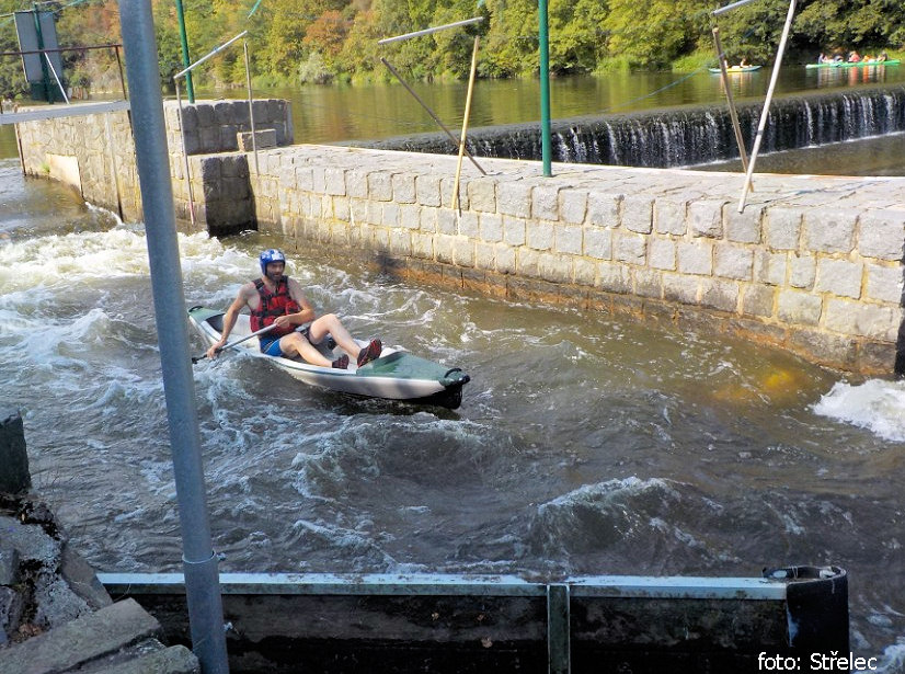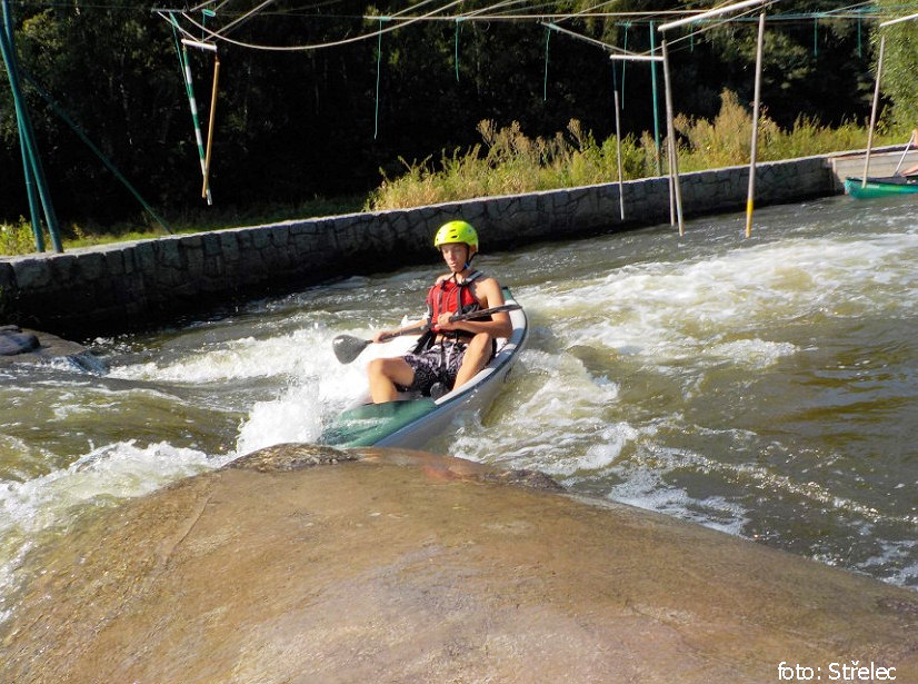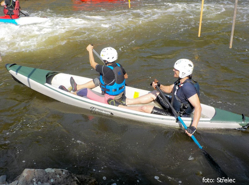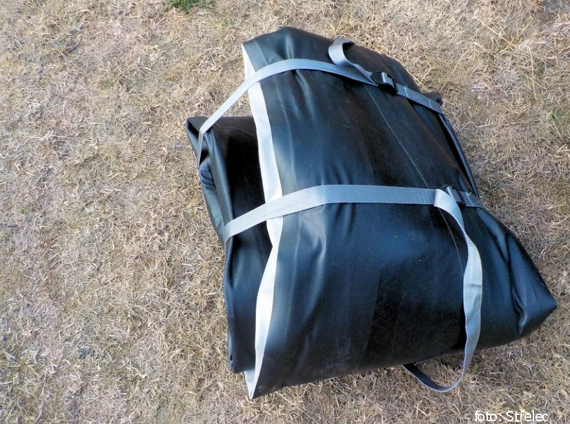 Po první akci jsem urychleně vyrobil dva stahovací popruhy pro snažší balení, aby srolovaná loď držela pěkně pohromadě. Druhá hladkovodní plavba byla půldenní po Hracholuskách připomínajících hustou hrachovku. Tam se ukázalo, že improvizovaná opěrka nohou z plastové trubky je sice lepší, než pouhý popruh, ale do ideálu má také daleko. Popruhy na balení jednoznačně splnily svůj účel. Další zkouška vlastností se konala v rámci OC mánie na kanálu v Roztokách u Křivoklátu. Pro tuhle akci jsem stihl vyrobit krátkou ploutev – chránič kolejničky – o délce asi 5 cm. Nová ploutvička neomezuje manévrování a zároveň stačí k zachování směru na mírně se pohybující vodě. Při překonávání překážek chrání záď před přímým kontaktem.