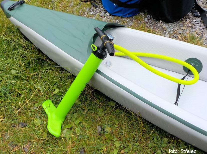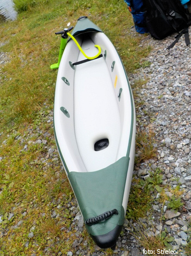 Koncem června jsem na základě recenze na Zray Drift na Pádleru udělal rychlý průzkum dostupné nabídky a na základě katalogových parametrů si vybral kajak Allroundmarin Flair. V ČR tehdy v nabídce nebyl, ale podařilo se mi ho objednat přes dovozce značky Allroundmarin. Jednomístný kajak Allroundmarin Flair má nominální rozměry 391x71 cm, hmotnost 15 kg, nosnost 210 kg a plnící tlak 0,9bar. Do základní sestavy kromě lodě a sedačky patří opravný set, nasazovací ploutev, opěrka pro nohy z kusu popruhu s našitým suchým zipem, pumpa s rezervním těsněním (s možností přepínat režimy podle potřeby), vyjímatelný soklík s dvěma uchy pod sedačku, deklarovaný jako „záchranný polštářek“ a celkem zajímavý batoh, který ale znehodnocuje konstrukce popruhů dělaných na postavu zhruba krychlového tvaru o hraně 150 cm (popruhy jsou přes 20cm od sebe, takže jeden mám na rameni a druhý vedle druhého ramene, prsák vychází ve výšce krku). Loď je v barevné kombinaci černá (dno zvenčí), šedá (boky, vnitřek) a zelená (paluby doplňky) Poslední barva je volitelná, v nabídce je ještě červená a žlutá.