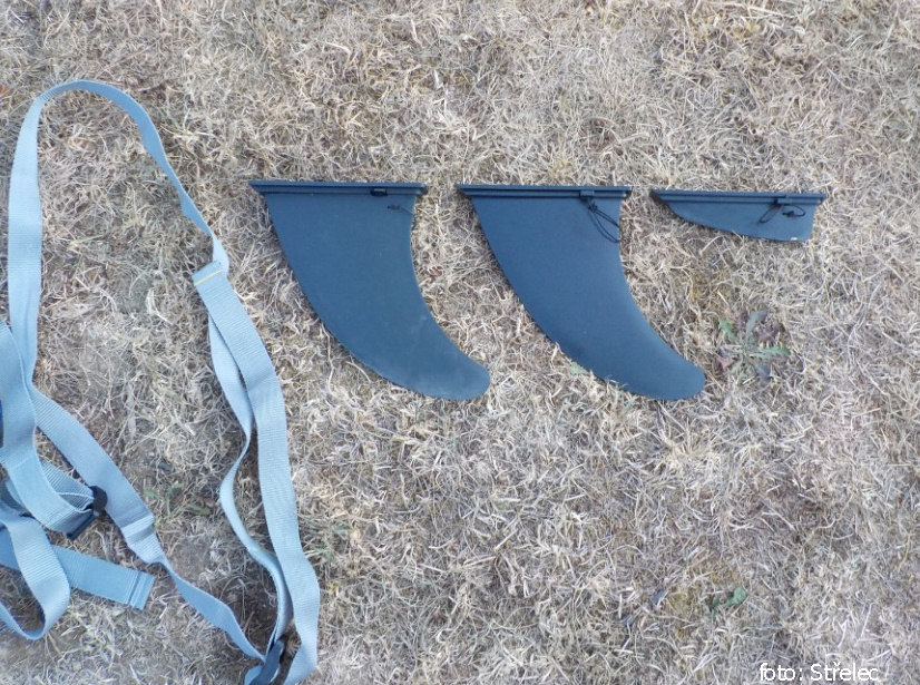 Ploutev se upevňuje do plastové kolejničky na spodní straně zádě. Je dlouhá 25 cm a tvoří ji relativně pružný plast, v loži ji zajišťuje příčný klínek s odpruženou západkou. V případě potřeby ji lze nahradit obdobnou ploutví od ITIWIT (SUP fin L black), která je o kousek delší, ale má jak rozměrově, tak systémově shodné upevnění. Uvedenou „náhradní“ ploutev od ITIWITu lze použít jako polotovar pro výrobu krátké ploutvičky – chrániče kolejničky pro plavbu v mělkých nebo tekoucích vodách. Opěrka pro nohy z popruhu pošitého suchým zipem se ukázala jako nedostatečná. Nouzově jsem ji po první plavbě nahradil poněkud delším popruhem s opěrkou z kusu plastové trubky obalené Mirelonem, ale i ta má k ideálu daleko.