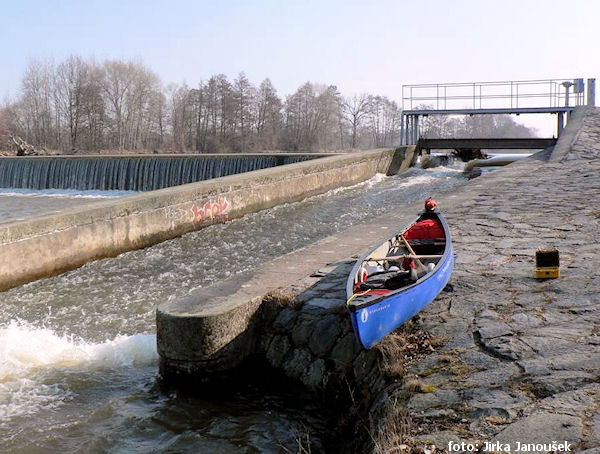 Ráno se budím zase brzo a po výtečné snídani při východu slunce spouštím loď na vodu. Řeka se rozlévá do šířky, už moc neteče, ale v ranním chladu se pádlováním alespoň zahřeju. U prvního jezu v Hradci musím zase vyndat kolajda. Nějaký lenoch nevytáhl dost vysoko hrazení z jinak hezké šlajsny.