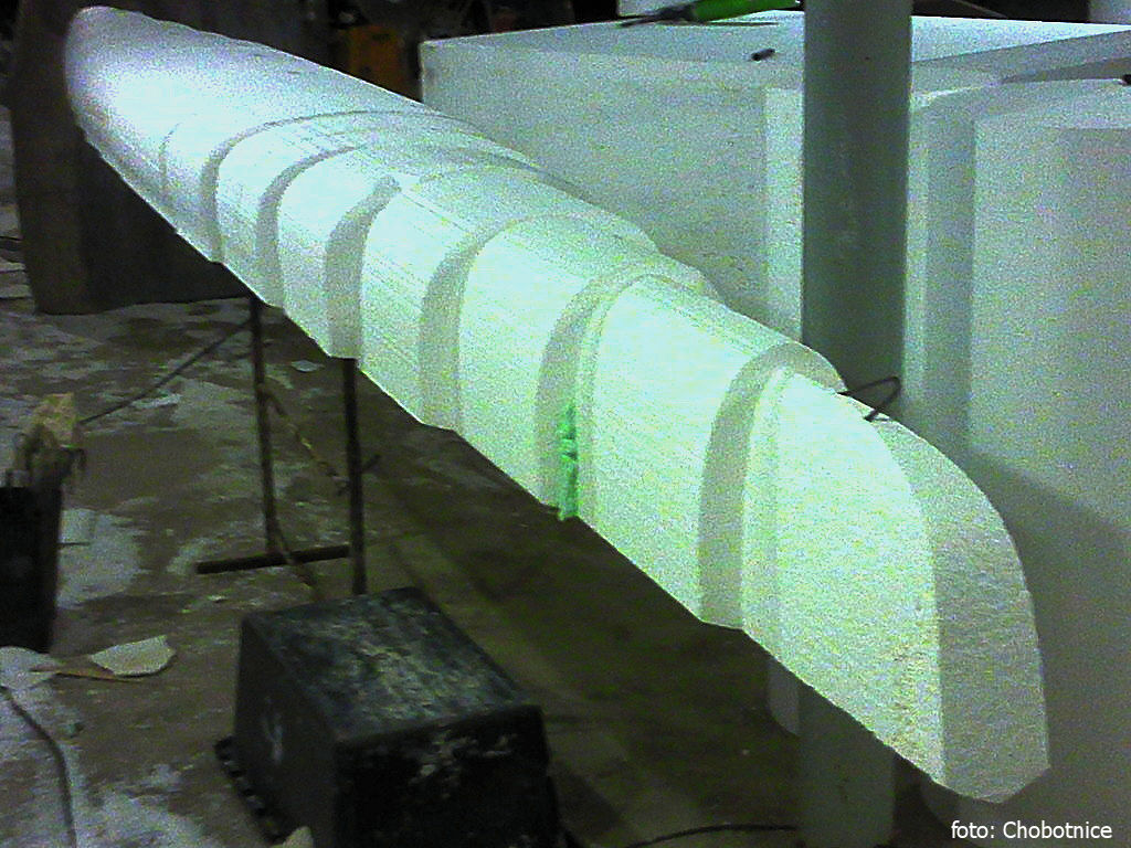Vyplotroval jsem si tedy polotovary na polystyrenové kopyto, navlékl je na silnou rovnou fošnu, aby kopyto drželo tvar a opracoval ho do podoby budoucí lodě.