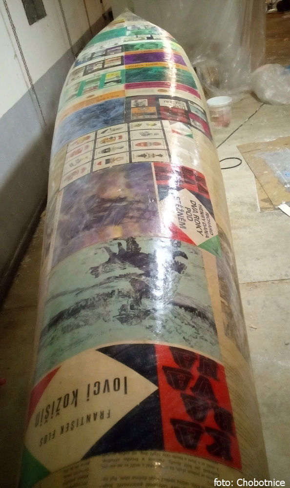 První vrstvu jsem lepil z ilustrací, ale obrázkem dolů, aby později byly pohledové na vnitřku lodi. Pak nastal čas pro rodokapsy. Na jednu vrstvu padly dva. Natřel jsem vždycky štos listů, nechal zvláčnět a nasáknout lepidlem a po chvíli lepil a přihlazoval na kopyto. Maximálně dvě vrstvy denně, aby vše stíhalo prosychat. Poslední, sedmnáctou vrstvu jsem lepil zase z ilustrací, tentokrát pohledovou zvenku. Poté nastala pauza na prosychání, která se skrze zvraty osudu protáhla na víc jak rok.