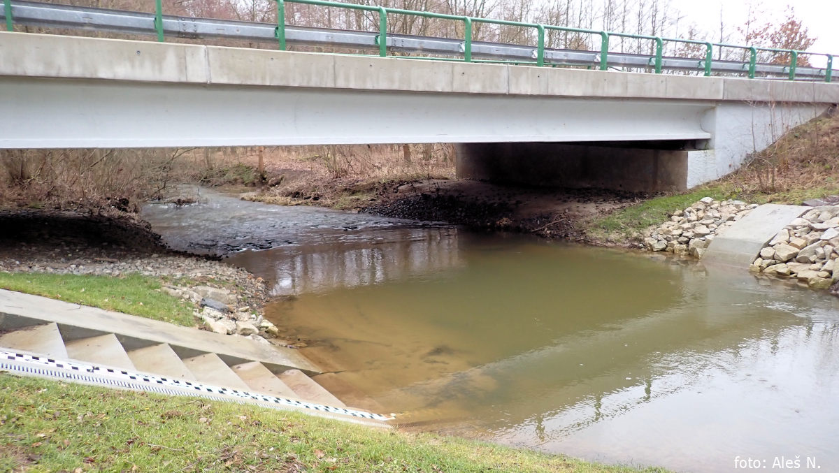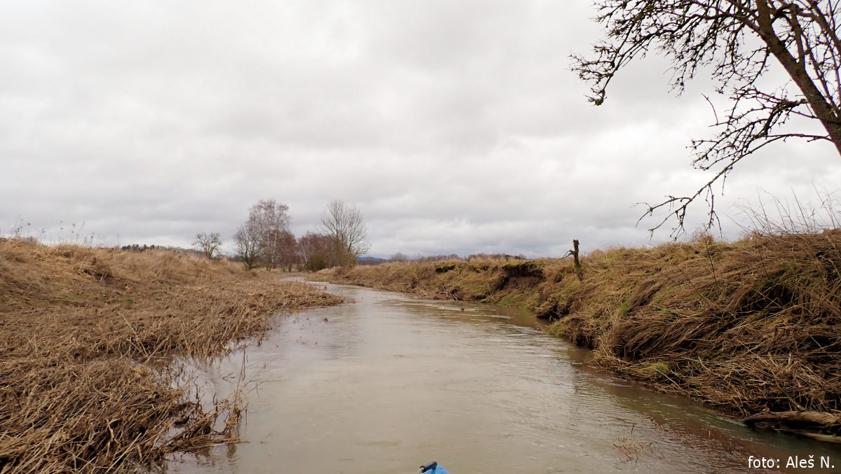 Přejíždíme na Sázek. Začínáme u továrny u mostu pod obcí Lesina. Voda je tu o poznání kalnější a koryto vypadá jinak. Je to taková narovnaná odvodňovací strouha. Vody má ale dostatek, tak jdeme na to.