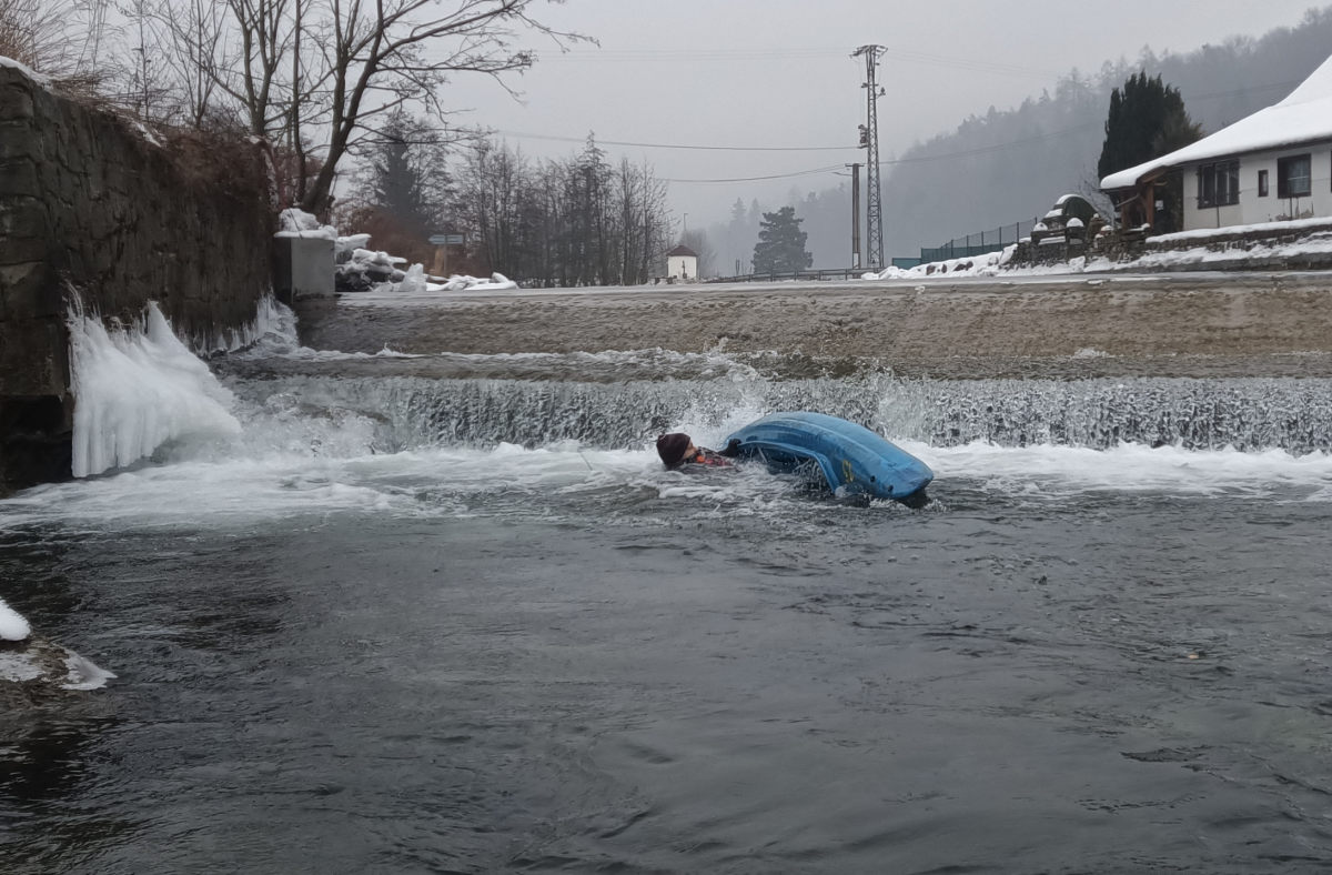 Jenže za 200 m se ukáže, že zážitek nebyl dost intenzivní a tak si dává repete. Doprovodné auto stojí kousek níže, první loď v Raškově odpadá. Nás ale čeká zajímavé místo s peřejnatým místem mezi kameny, kde led a sníh zúžil průjezd na cca 1,5 m. Moc pěkně to nevypadá, vody málo, kamenů hodně. Největší problém má naše loď, kdy jedeme jako jediní dva v lodi, jsme více těžcí a kámen v rychlém proudu nás odhodí pod ledovou kru. Ostatní projíždí celkem s přehledem.