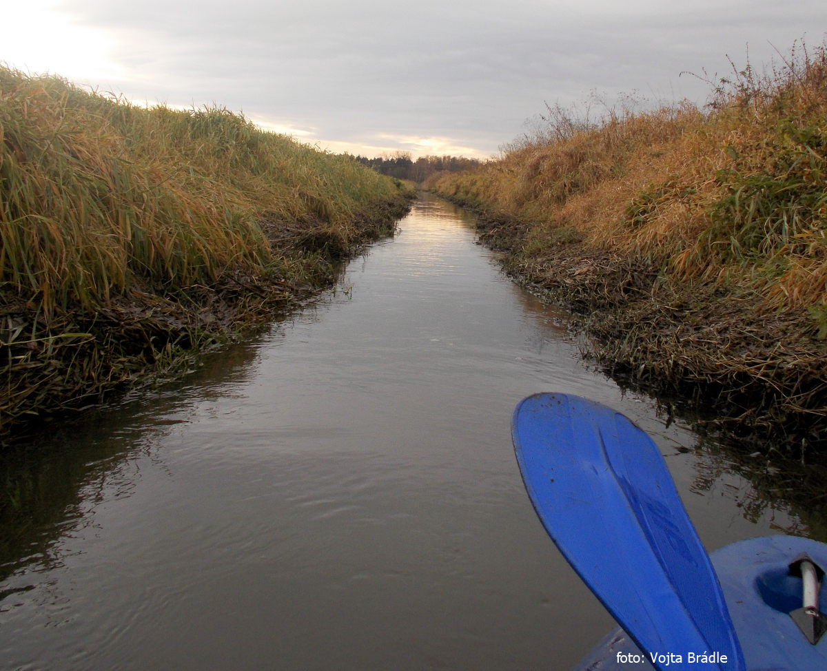 Těsně pod hrází jsem prorazil kratší rákosovou houštinu a mohlo se plout. V téhle části má potok podobu napřímené vydlážděné strouhy zařízlé do okolních luk. Její šířka není o moc větší než samotné lodi, takže pádlování vesměs představovalo odrážení se od břehů. Díky zregulování jsem aspoň měl dost vody, která navíc z přítoků postupně přibývala.