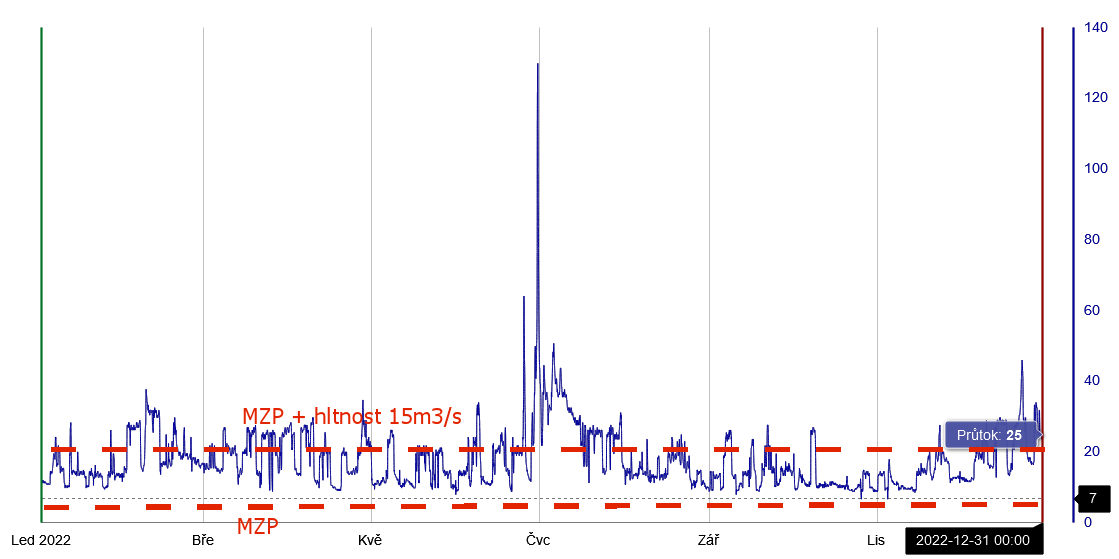Pokud vezmeme navrhovaný MZP ve výši 6,69 m3/s, tak tato situace v roce 2022 nenastala ani jednou a v roce 2023 pouze na 3 hodiny (opět krátké výkyvy způsobené asi manipulací na jezu Zátkův mlýn). Vzhledem k přítokům mezi Březím a Dívčím Kamenem je nutné odečíst několik stovek litrů, které za letních dní mohou protékat Kremžským potokem. Přesto to nijak zásadně výše uvedené hodnoty neovlivní. Vodní stavy byly vždy vyšší než navrhovaný MZP a to minimálně o 1,5 m3/s. Přesto už byl problém s průjezdem.