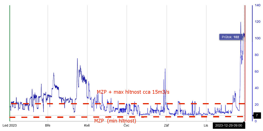 Sestavili jsme graf průtoků na vodočtu Březí pro roky 2018, 2022 a 2023, ze kterých je zřejmé, že v těchto letech by nedošlo k naplnění představ investora o tom, že elektrárna vyrobí značné množství energie. Po většinu roku se vodní stav pohyboval pod maximální hranicí hltnosti turbín, které jsme odhadli na 15 m3/s (přiváděcí potrubí má být DN1500 a s porovnáním Lipno II), takže by 3 turbíny pracovaly jen v částečném výkonu. Orientačně by byl v roce 2023 průměrný nátok do náhonu 7,65 m3/s, takže by fungovala pravděpodobně 1 turbína stále, druhá v polovičním režimu a třetí by byla většinu času odstavena. Jsou to ale jen odhady, až budeme znát parametry stavby, můžeme udělat přesný výpočet i několik let zpětně. Přesto je z grafu patrné, že po většinu roku bylo vody méně a výkon MVE by byl v lepším případě poloviční, ale spíše nižší.