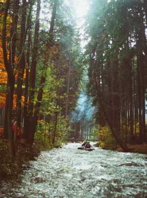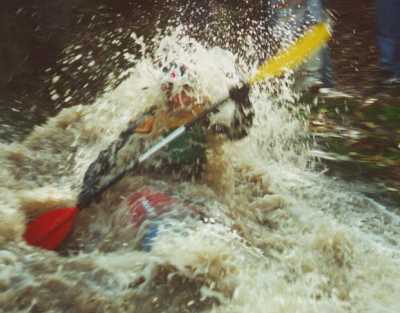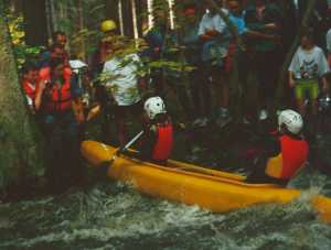 rozestavěných těsně podél břehu celé zatáčky. A dívat se bylo opravdu na co, protože každou chvíli se někdo nedobrovolně ponořil do zakalených vod potoka. Nejvíce mě však zaujala dvojce (táta na kormidle se svým asi 11-letým synem na háčkovi) na plastové otevřené kánoi, kteří se chystali vrhnout do esovité zatáčky. Nájezd se jim povedl, ale proud je do druhé části zanesl níže, než bylo potřeba a tak nestačili srovnat loď do posledního oblouku. Ke zděšení diváků, stojících právě v místě ohybu potoka, si to namířili přímo mezi ně. Vylétli se svojí lodí na břeh za doprovodného hulákání otce na syna, ze kterého mohu vybrat snad jediné slušné slovo přitahuj. Naštěstí se nikomu nic na břehu nestalo, i když nějaká modřina asi byla. Loď pak sklouzla opět do vody a tak se ani neudělali.