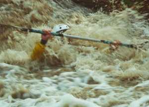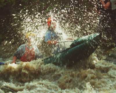 unášet tak, že loď se stáčela kolmo na proud a tudíž hrozilo připlácnutí ke kládě a následné udělání. Již vybudovaným reflexem z podobných situací jsem vyskočil na kládu, jenže háček to nestihnul. Připlácnul se na ni jako na hrazdu a tím se dostal z lodi. Já jsem jen naskočil z klády opět do lodi, když ji podjela, jenže háček tam furt visel a s odporem hledíce na studenou vodu nevěděl, zda tam má spadnout hned, nebo až za chvilku. K tomu ho sledovalo několik dobráků ze břehu, kteří se již začali popadat za břicha. Pak však přišlo něco, co nikdo nečekal. Aby si zachoval důstojnou tvář, pustil se, podjel pod kládou a vše zakončil efektním telemarkem s rozpaženýma rukama. Díky malé hloubce a proudu tam zůstal v této pozici dostatečně dlouho, aby každému došlo, že to tak přeci zamýšlel hned od začátku!