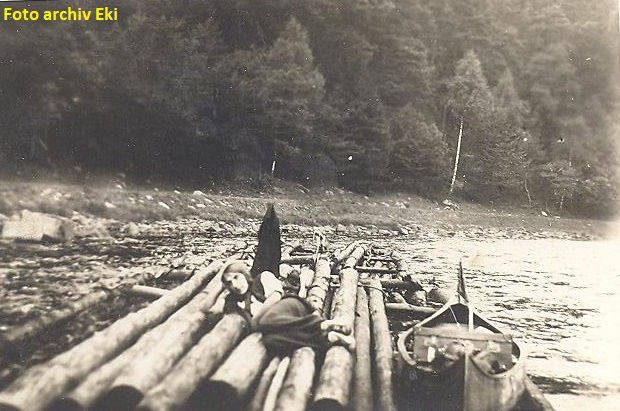 Každé léto ale bohužel někdy skončí. Svoji vodáckou sezónu roku 1932 ukončili babička a děda plavbou z Písku do Prahy po Otavě a Vltavě v době volna okolo státního svátku 28. října. Kromě čisté kanoistiky se svezli i na voru, šplhali na výhledy a babička dokonce cestou cosi upletla na zimu, jak ukazují následující fotky.