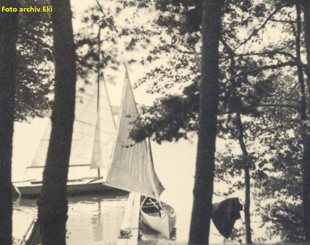 Výhled z chaty na rybník Staňkov s oplachtěnou žebrovkou v srpnu 1939