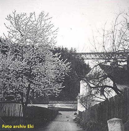 Hezkou vesnici Červená z předchozí fotky, včetně úseku Vltavy s divokými Červenskými proudy, najdete v současnosti pod hladinou přehradní nádrže Orlík. Vyfocený železniční most se však nad údolím vypíná dodnes.