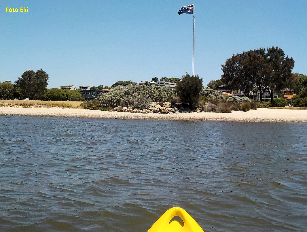 Vodácké štěstí mám až poblíž centra Perthu. Na levém břehu tu nabízejí nejen plachetnice (katamarány), ale i plastové kajaky. Půjčuju si tedy sit-on-top kajak na hodinu za 25 místních dolarů. Fouká silnější vítr od oceánu, proto mě kluk z půjčovny určuje, že mám plout proti větru západním směrem (k ústí do Indického oceánu), jinak bych se už nemusel vrátit.