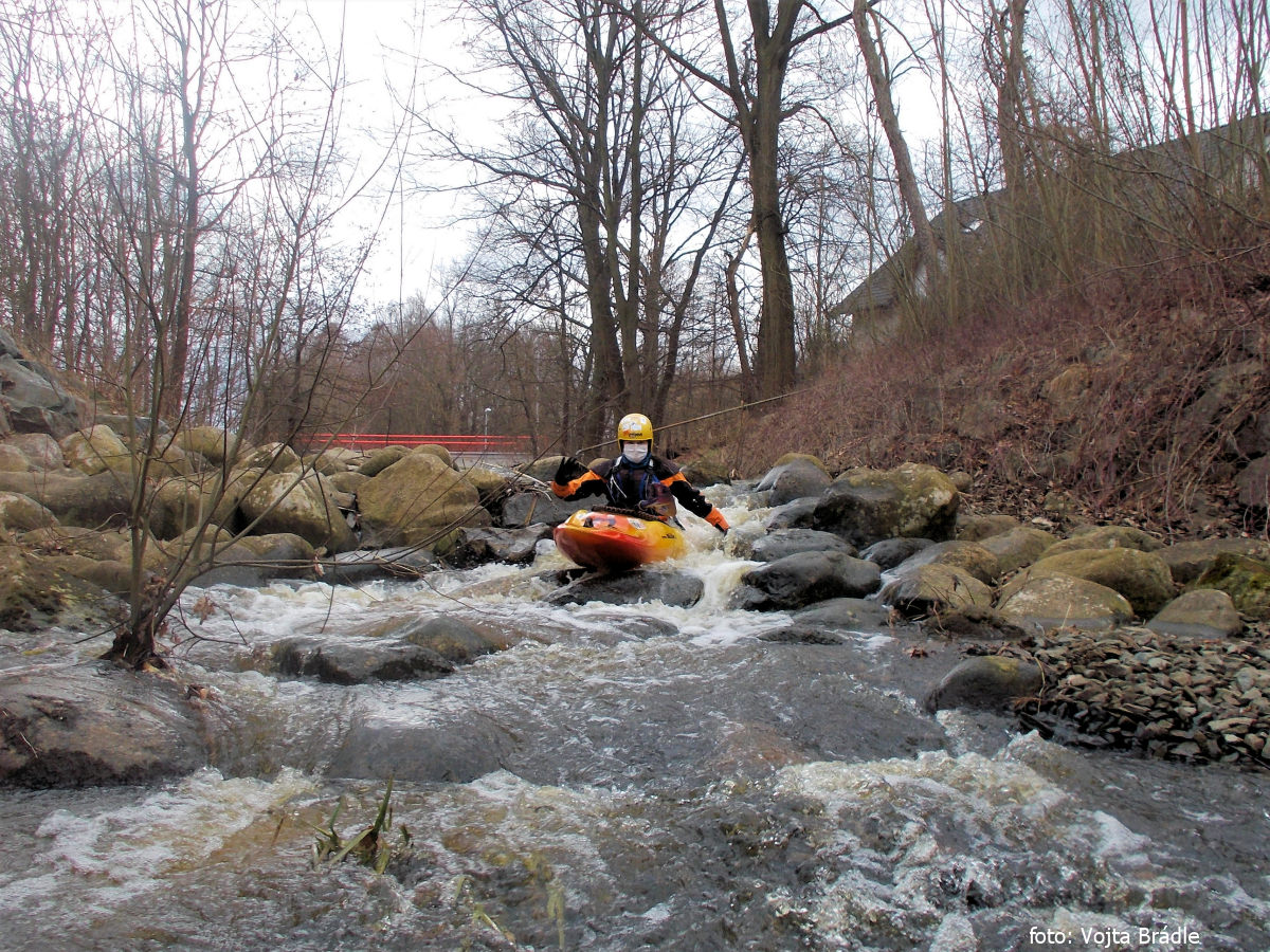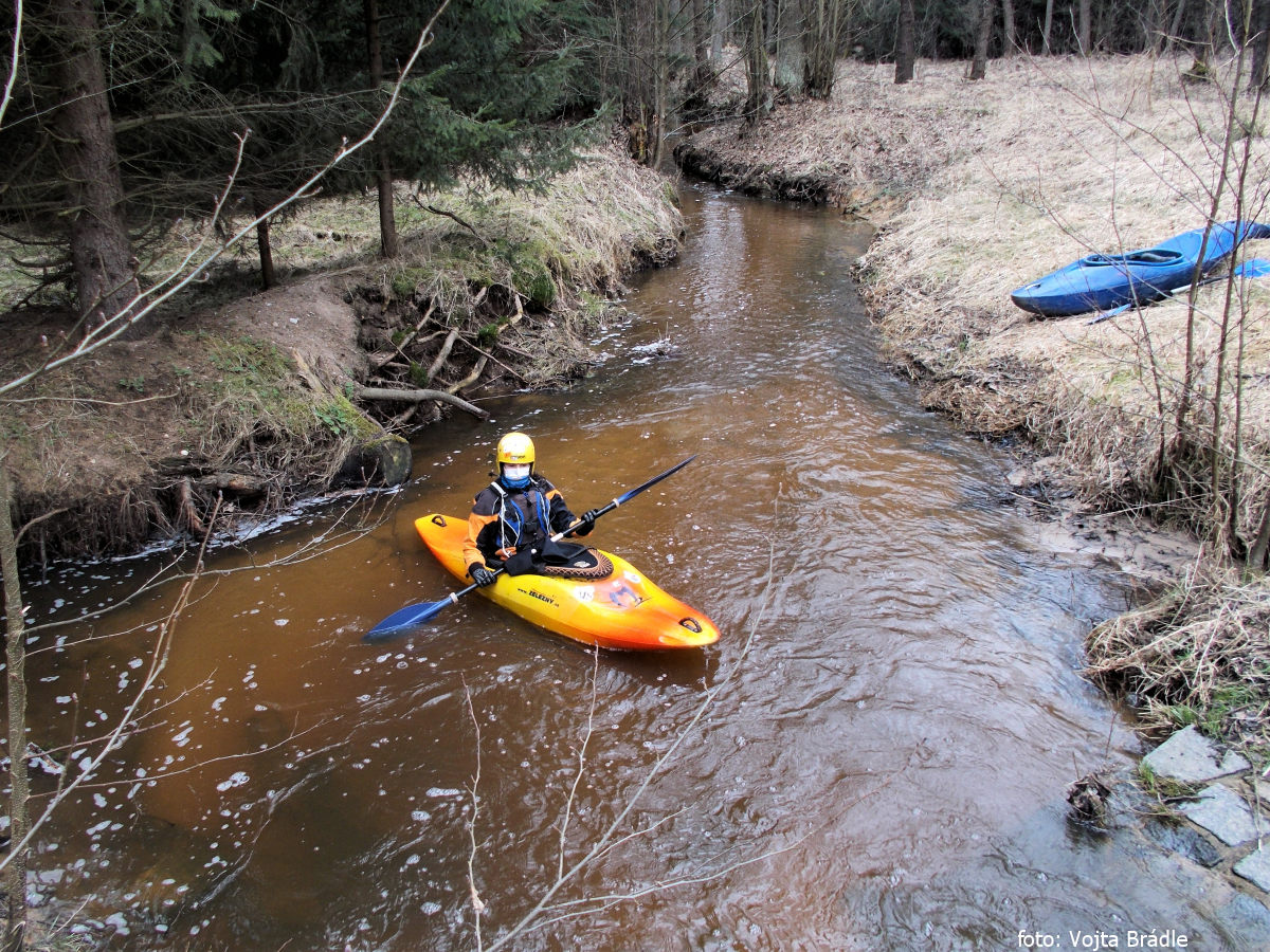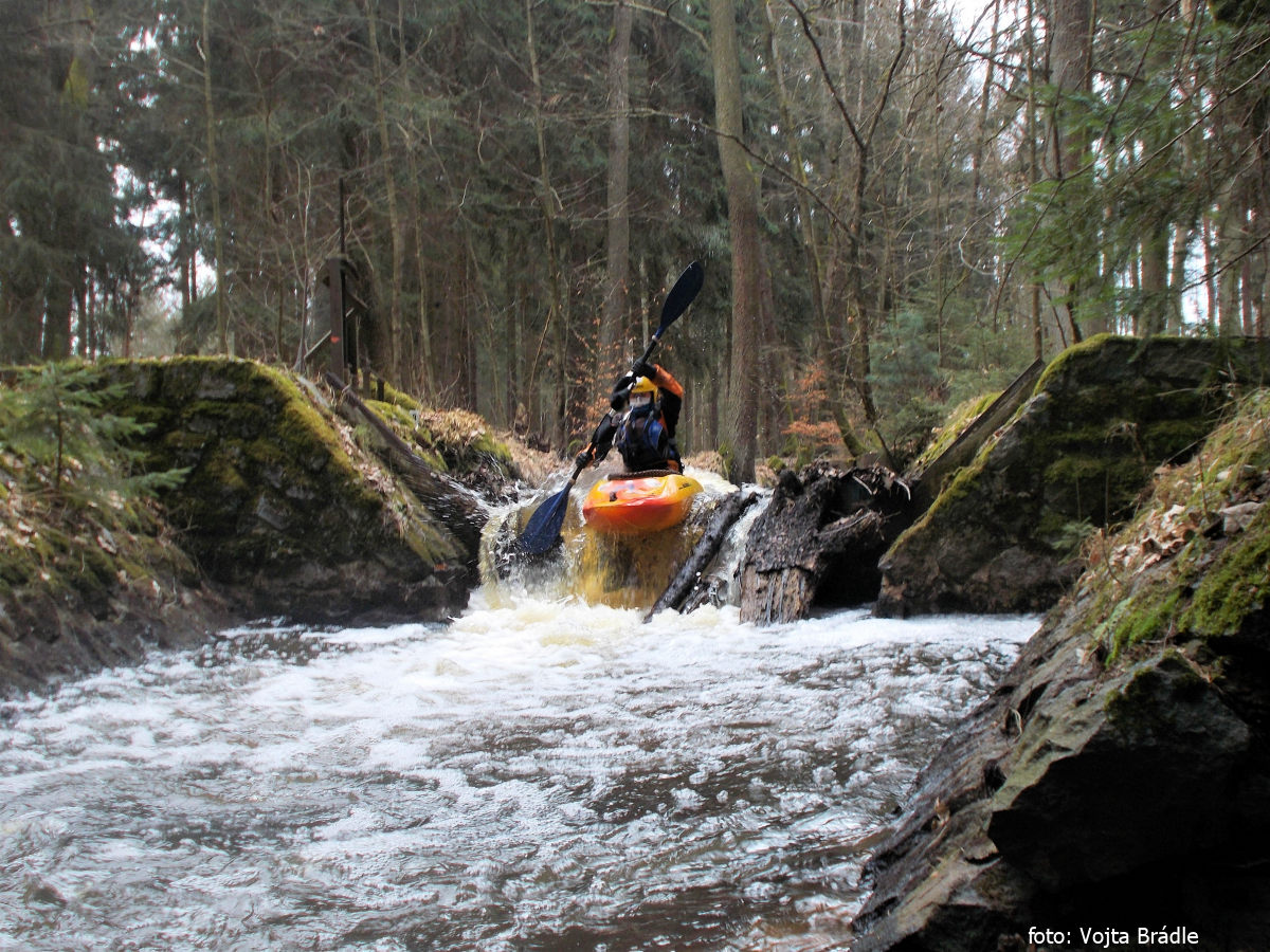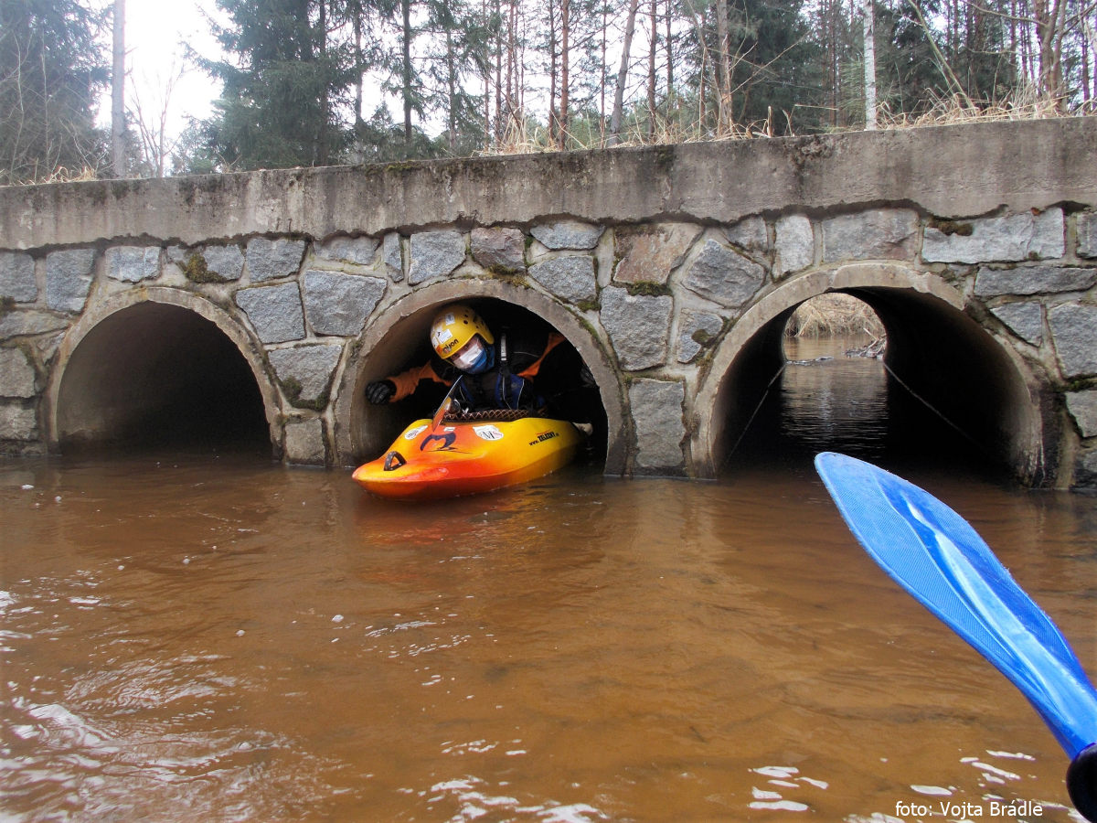 My zkoušíme štěstí a s trochou mlácení helmy o strop překážku zdárně zdoláváme. Znovu se objevují spadlé stromy, ale s našimi expedičními zkušenostmi je řešíme s bravurou rovněž v lodích. Takto se dostáváme i pod nízkou lávku kousek nad následným jízkem. Je to extrémně náročný skok o výšce několik stovek milimetrů a bez precizního boofu hrozí jednoznačné odření špičky lodě. Později však kapitulovat musíme. Lávka na ústí do Stříbrného potoka je za našeho stavu nezdolatelná.