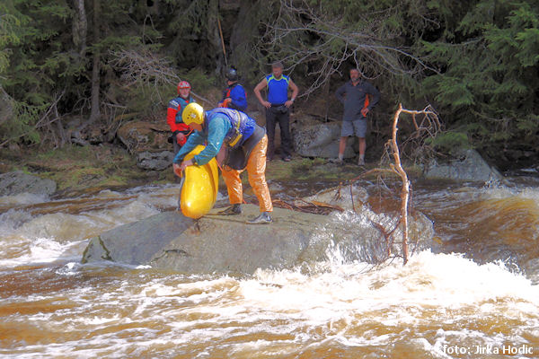 Jedu ostražitě a koukám i po jezdcích za sebou. Najednou vidím, že singlíř přede mnou se v šikmé vlně s kohoutem zvrhává a po nekonečných vteřinách s hlavou pod vodou plave. Naštěstí je během chvilky u břehu i s pádlem. Píšťalkou dávám těm vepředu signál, že se něco děje. Pod kaskádou všichni zastavujeme a s pomocí házečky pomůžeme plaváčkovi uvolnit a zachránit loď, která se zachytila na balvanu.
