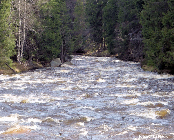 V sobotu jsme Čeňkárnu otočili čtyřikrát a někteří z nás, kteří se chystali v neděli na perlu šumavských řek Vydru, poněkud nervózně sledovali rychle rostoucí stav hlášeného vodočtu v Modravě. Večer dokonce dosáhl 1. stupně povodňové aktivity, přes 30 m3/s. Po zlegalizování splouvání úseku z Modravy na Antýgl jsme předloni za nízkého stavu „sprášili“ Vydru k jezu, který odvádí část průtoku do Tetovského kanálu. Dál plout prostě nešlo. I tak to nahoře byla kličkovaná mezi kameny a na některých širších místech bylo vody málo a dna našich lodí občas „zakopla“ o kámen. Nevěděli jsme tedy, co pro nás Vydra za tohoto stavu připraví. Navíc cyklistická sekce hlásila, že byla v sobotu odpoledne pod Modravou svědky „vraždění neviňátek“.