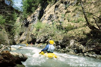 Zastavujeme na klidné hladině, vzájemně se strašíme druhou soutěskou a postupně do ni vplouváme. Je hlubší, asi 100 m dlouhá, s asi 30 m vysokými kolmými stěnami vystupujícími přímo z vody. Tady by byl problém zastavit, vracáky jaksi chybí. My po předchozí prohlídce z mostu víme, že nás žádná překážka nečeká, zaklíněný kmen je vysoko nad hladinou. Pluji skalním korytem širokým 3- 4 metry, voda letí velkým spádem. Objíždím několik zalitých balvanů a bez problémů překonávám vlny a válečky pod stupni. Tohle bylo tak za 3. Opět se všichni scházíme na voleji za soutěskou, která náhle skončila. Říčka se dál rozšiřuje a vody je zase málo. Končíme tedy těsně za starým mostem a lodě vynášíme na levém břehu po strmé stráni k seníku a pak pěšinou až nahoru na parkoviště. Délka splutého úseku je jen kilometr, z toho soutěska je dlouhá asi 300 m, ale stálo to za to.