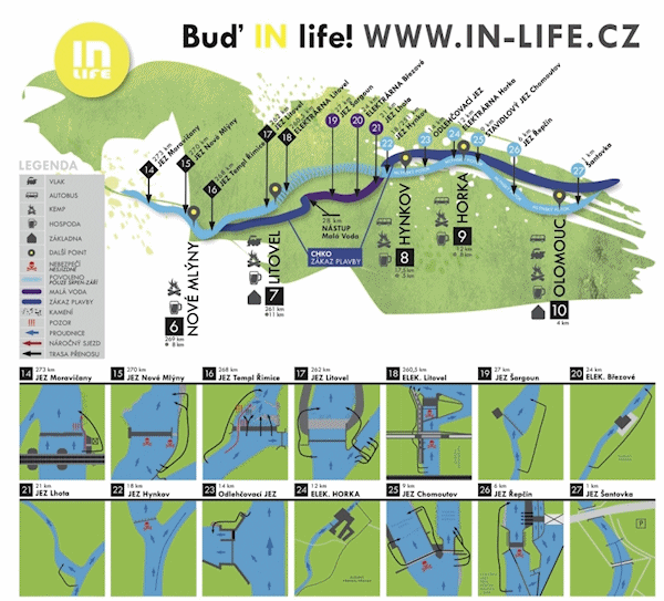 Pokud chcete plavbu na kratší dobu, je možné začít z jakéhokoliv InLife pointu od Postřelmova po Olomouc… Navíc je od 1.8. konečně otevřen úsek Litovel - Hynkov po hlavním rameni řeky Moravy.  Jedná se o náročný, ale zajímavý usek řeky, kde se jindy než v srpnu nedostanete. Původní, nijak neupravené a neprořezávané koryto v srdci CHKO Situace na dalších místech na řece Moravě není špatná, jak je možné vidět na aktuálních fotkách pořízených 3.8.2015:
