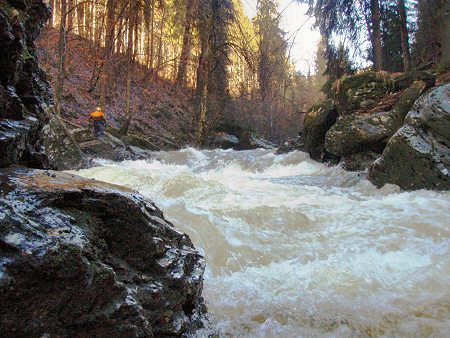 Part WW IV begins with cascade - ship center then jump right (under jump is stone, danger for long boats!). This part is accessible from road ږ better to view ... Next problematic parts with big drop and many stones (WW IV)